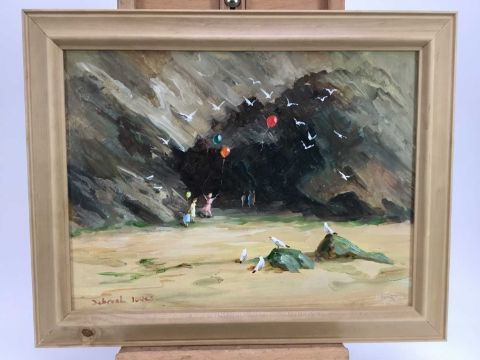 Deborah Jones (1921 - 2012) oil on board - children playing in the sand, signed, 29cm x 39cm