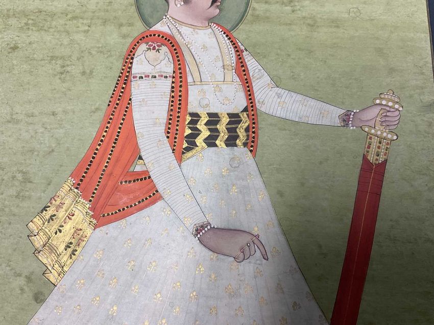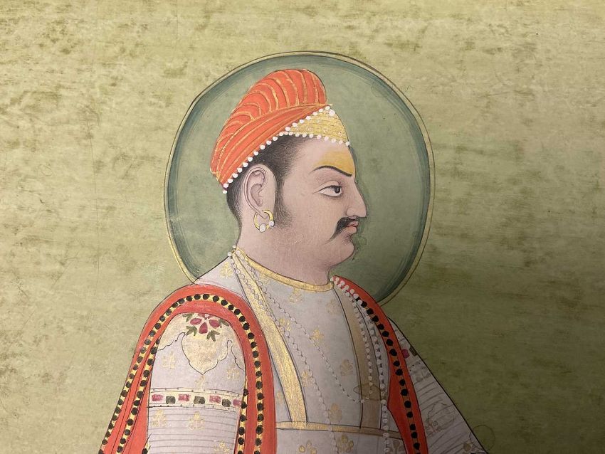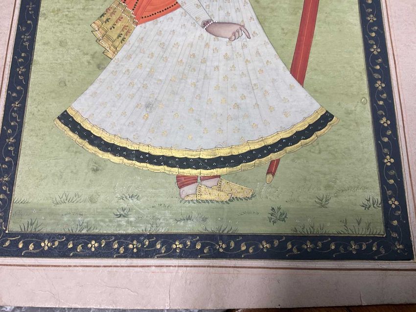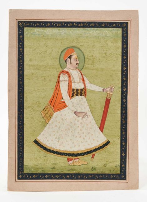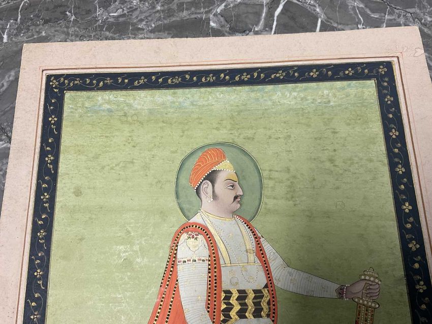 19th century Anglo-Indian school, gouache depiction of a nobleman, in side profile with sword, foliate border, image 30 x 20cm