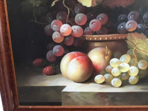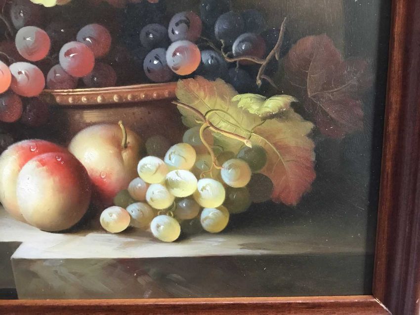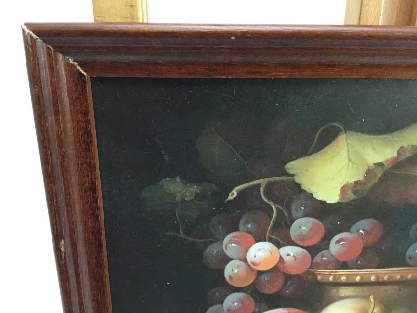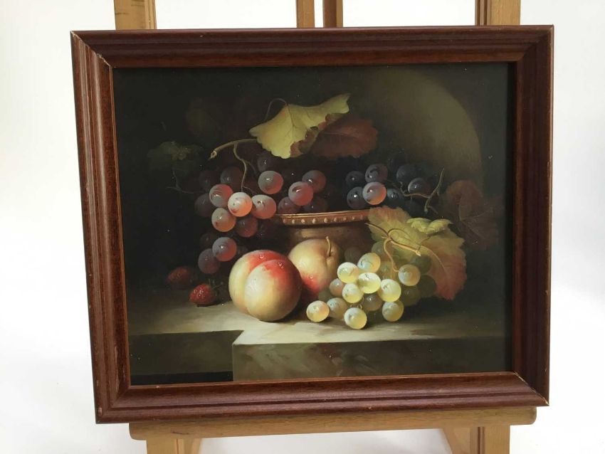 Continental school - Still life with fruit, oil on wood board, framed, 28cm x 24cm overall