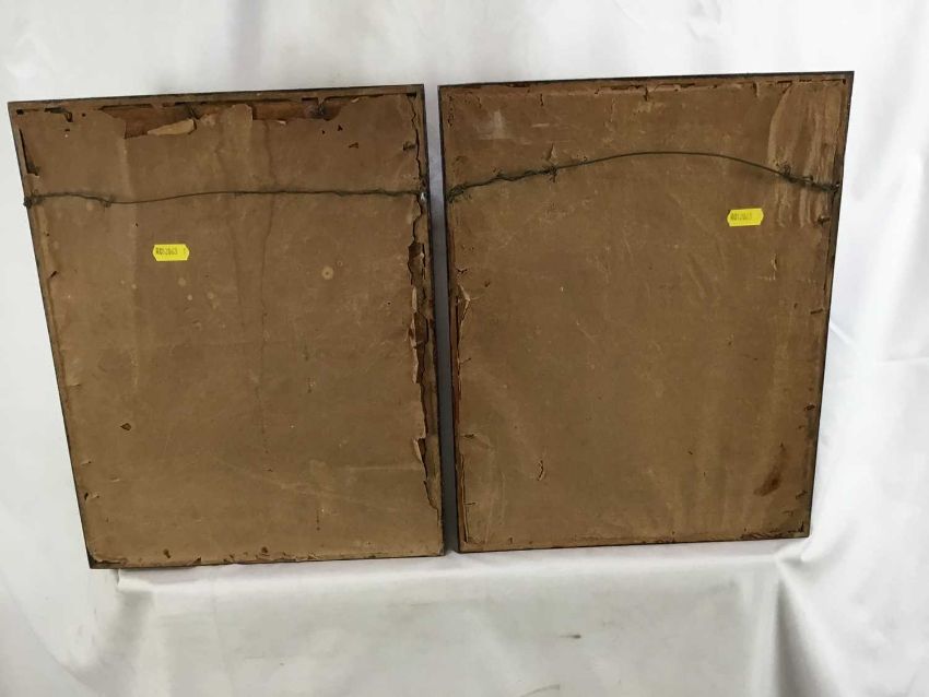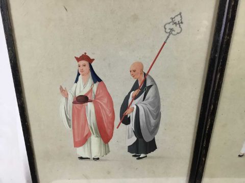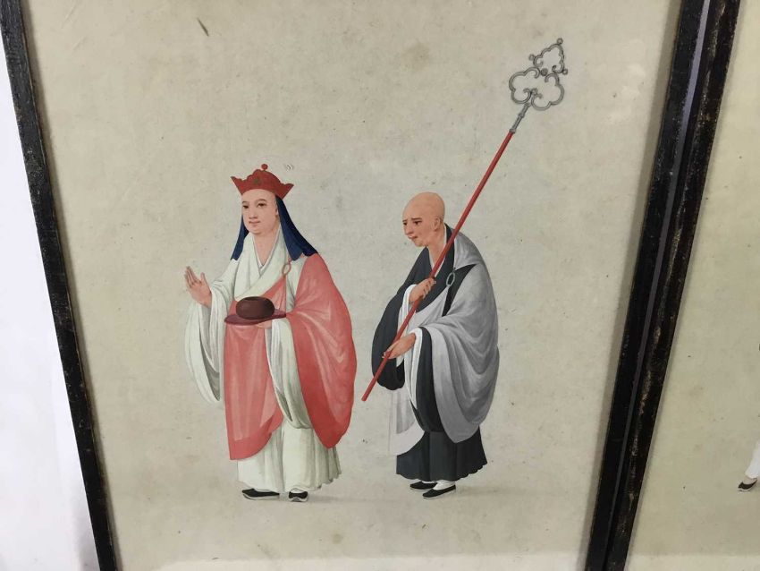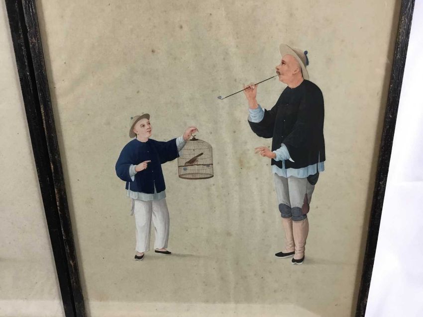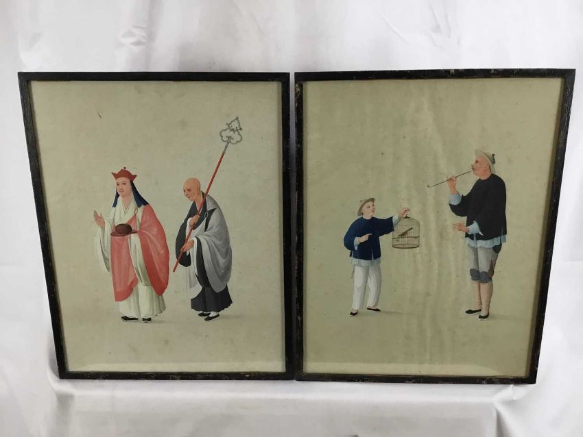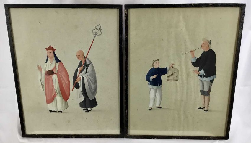 Two antique Japanese gouache works on paper - priest figures and boy with a bird cage, both 27cm x 35cm in glazed frames, 29cm x 37cm overall (2)