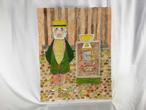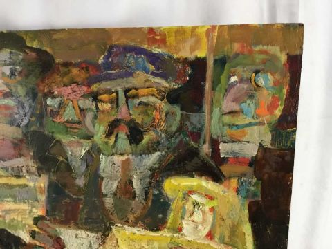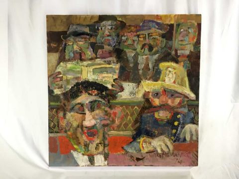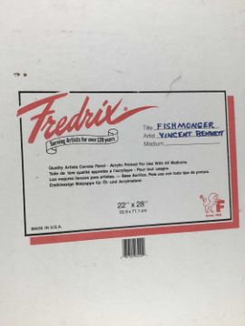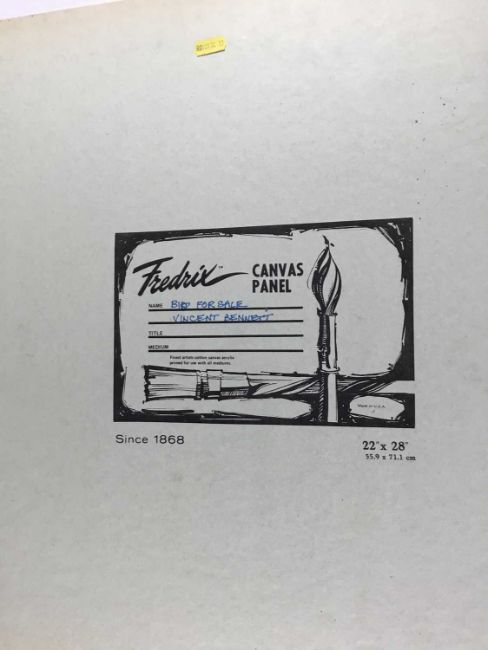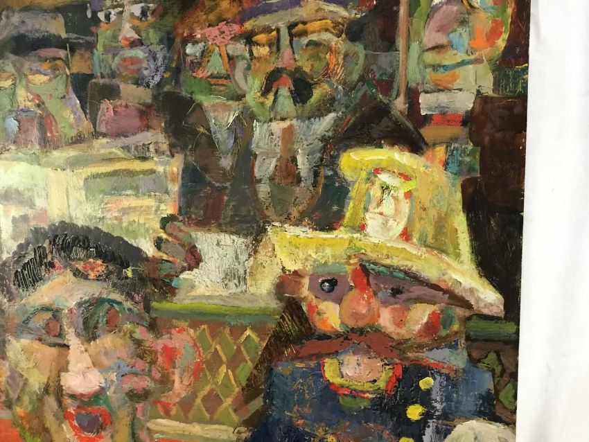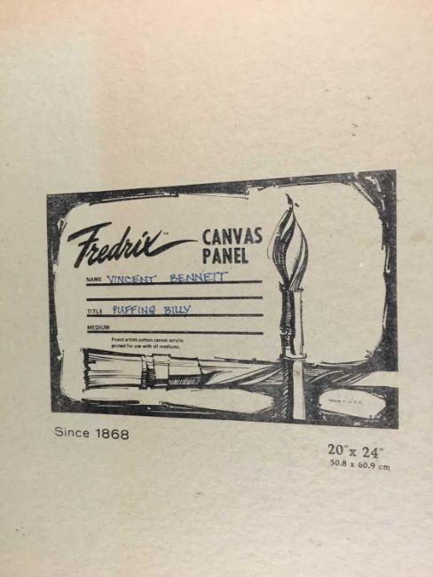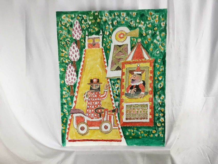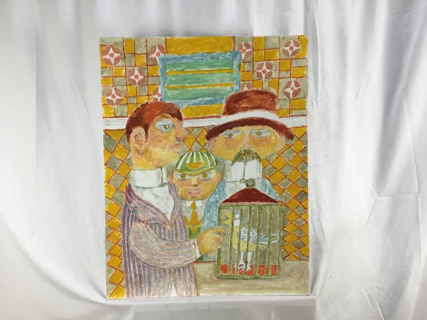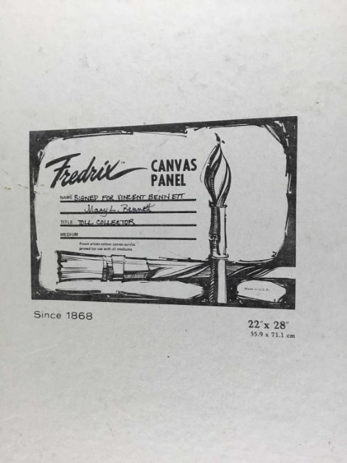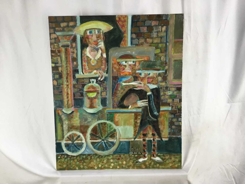 Vincent Bennett (1910-1993) five works, oil on board - 'Omnibus' 61cm x 61cm, signed and dated '74, titled verso; 'Puffing Billy', 51cm x 61cm, titled and signed for (by Mary L Bennett) verso; 'Toll Collector', 56cm x 71cm, titled and signed for (as before) verso; 'Bird for Sale', 56cm x 71cm, titled and signed for (as before) verso; 'Fishmonger', 56cm x 71cm titled and signed for verso. (5)