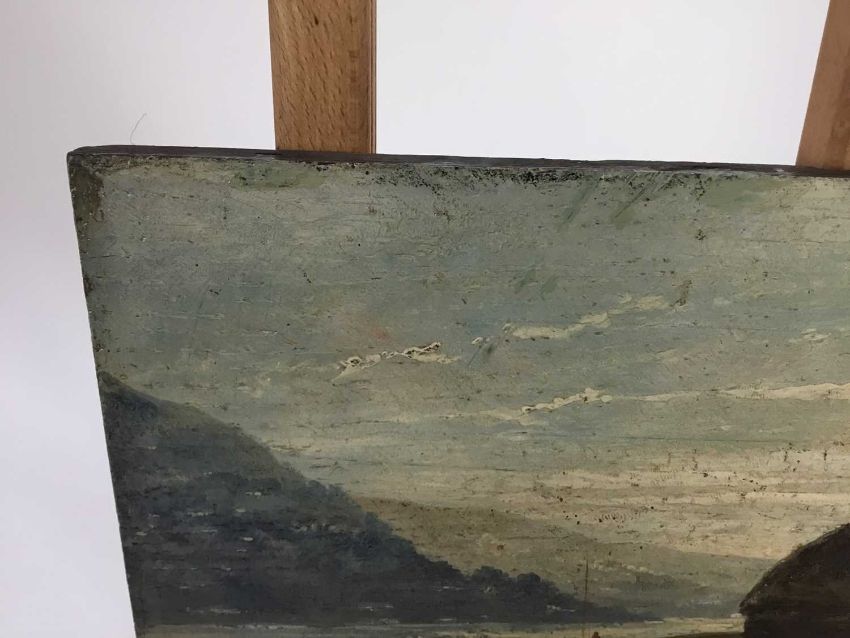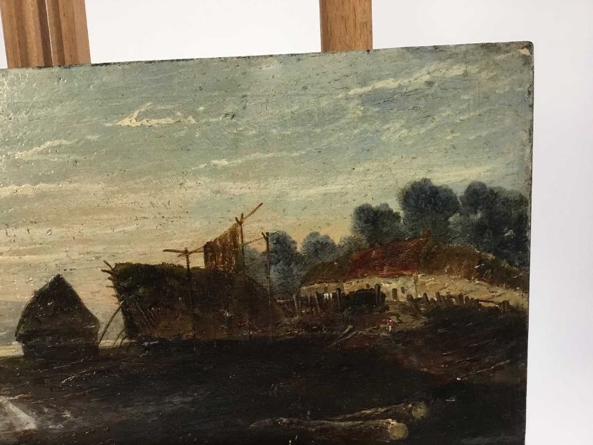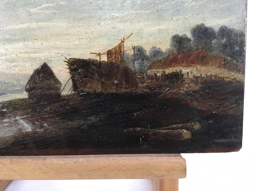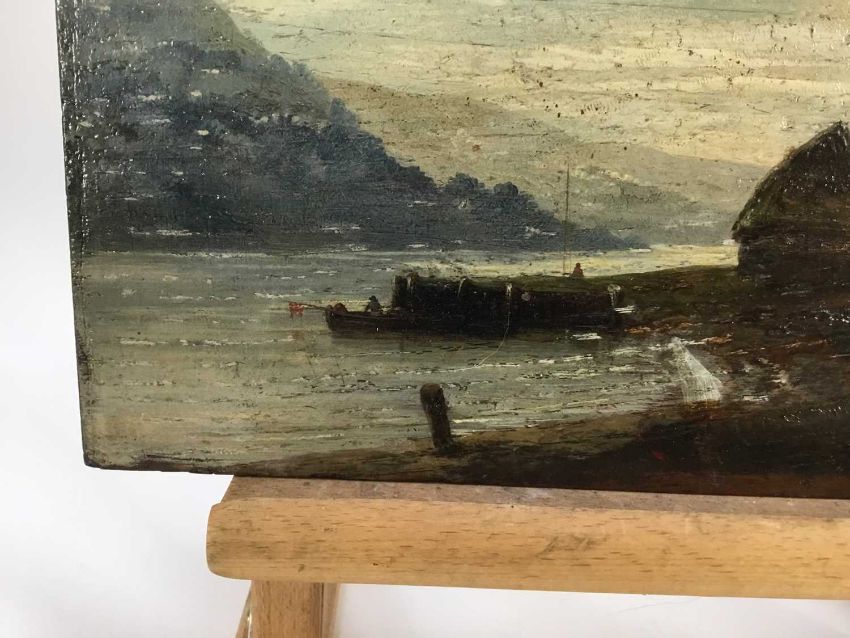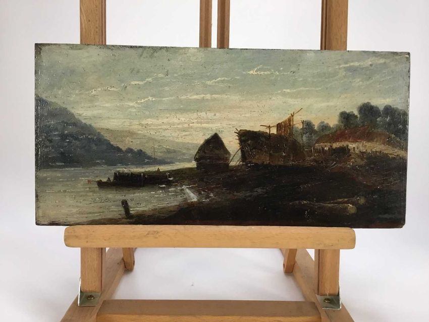 Scottish School, 19th Century oil on panel - A river estuary, fisherman's hut with fishing boat, 36cm x 17cm, unframed