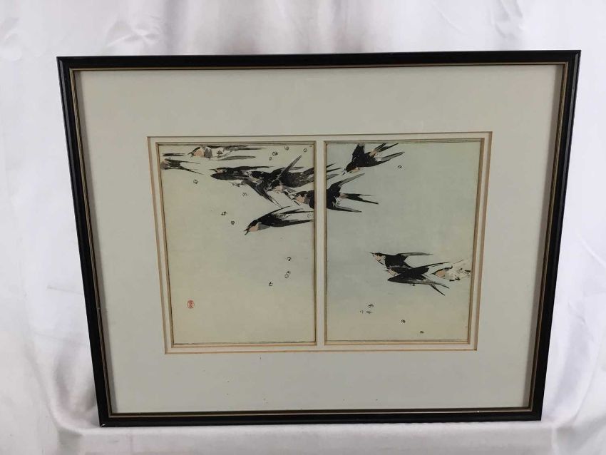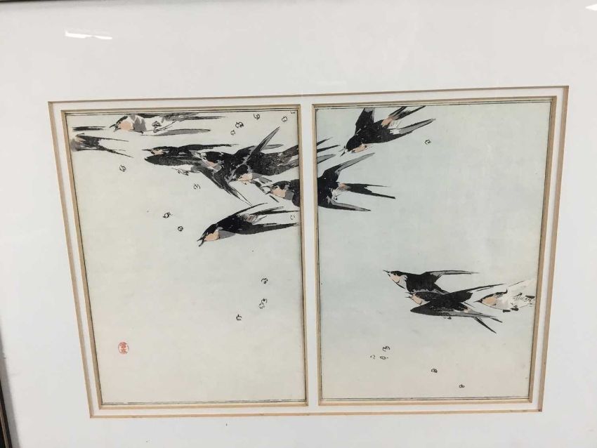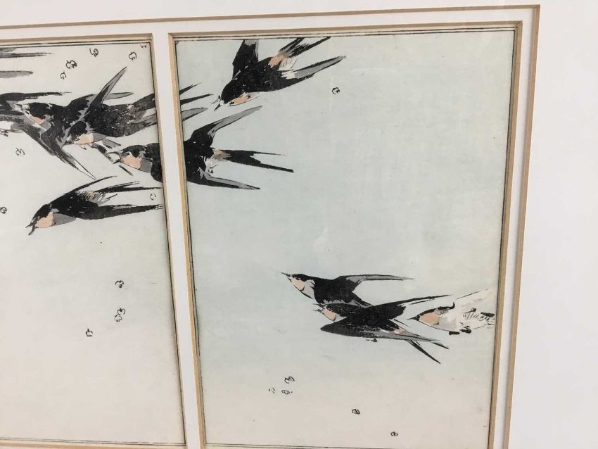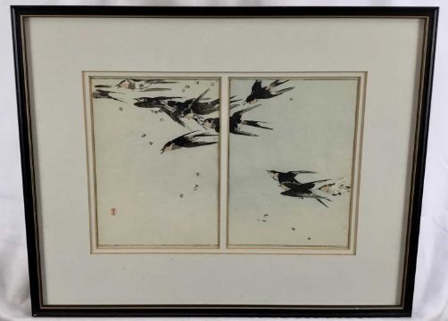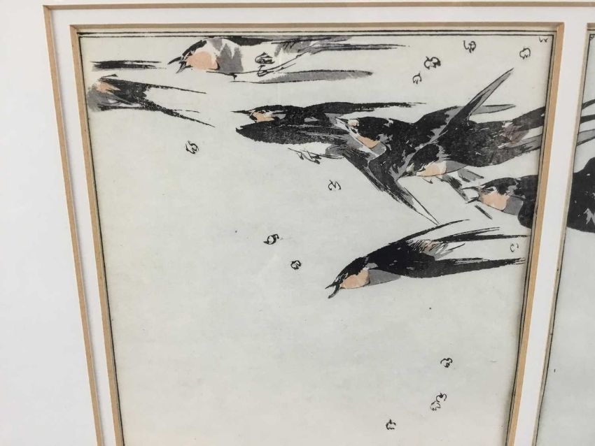 Japanese print, Watanabe Seitei (1851-1918) - birds in flight, with artists seal, the two panels together measuring 30.5cm x 21cm, mounted in glazed frame, 47cm x 38cm overall