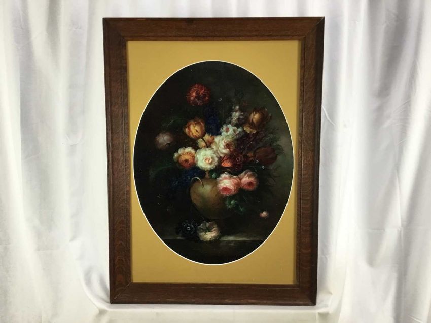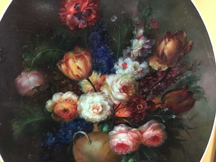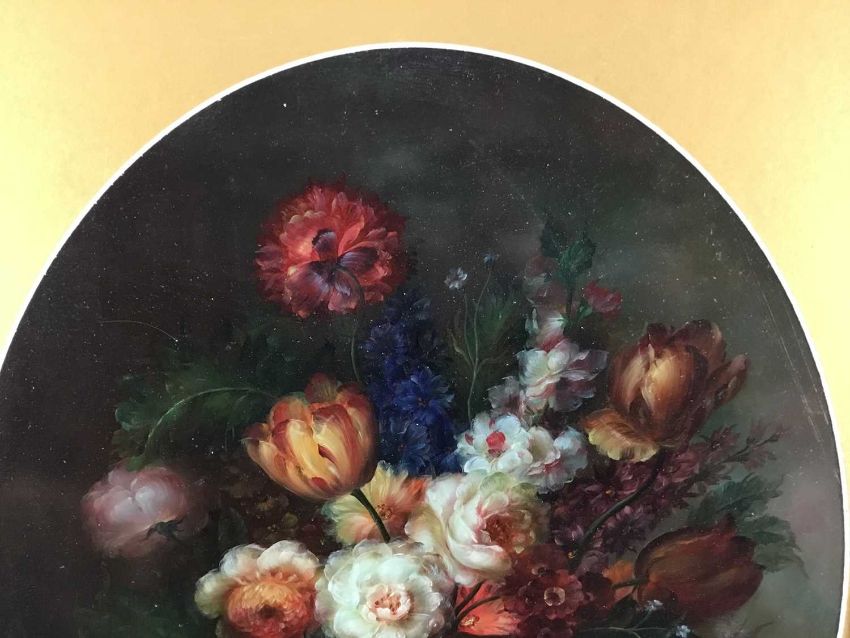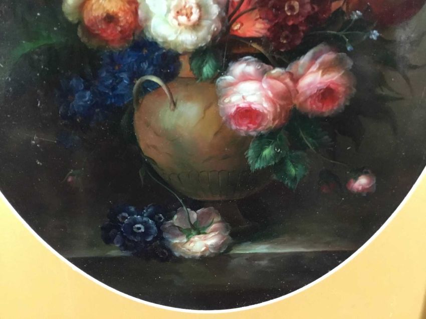 Emilio Greco oil on wood board - still life of flowers, 38.5cm x 49cm in oval mount, 51cm x 68cm overall, framed