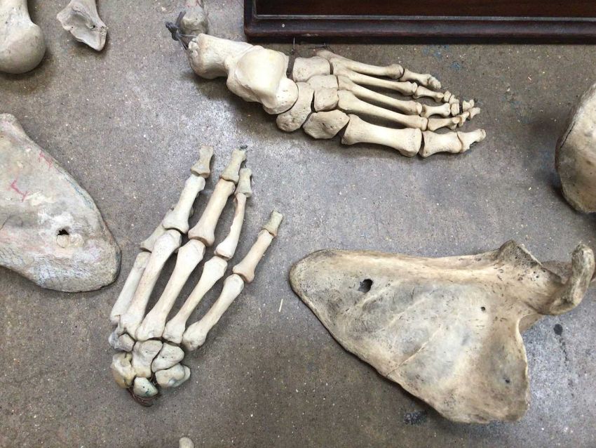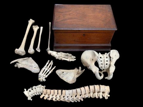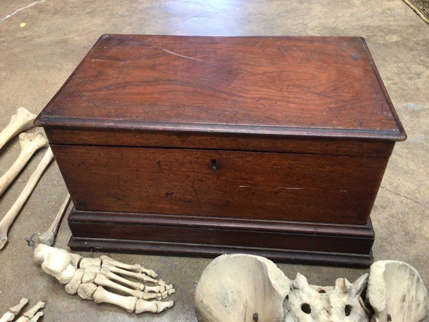 Homo sapiens: a group of human bones in a Victorian mahogany casket, to include a pelvis, spine, foot, hand, tibia, etc. Some pieces joined by wire. Cause of death unknown but bones have purportedly been contained in this casket for several decades.