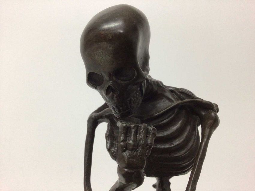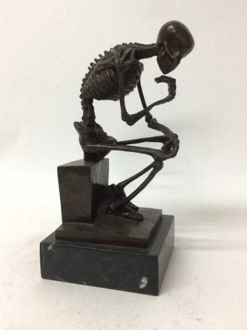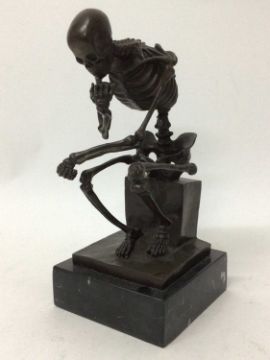 Bronze sculpture of a skeleton after Auguste Rodin, signed Milo, mounted on a black marble base, 28cm overall height