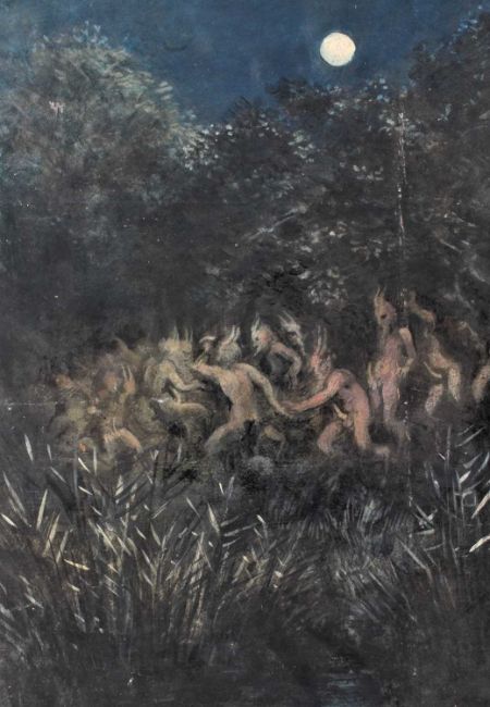 David Hill (1914-1977), egg tempera on board, Black mass, 40 x 28cm