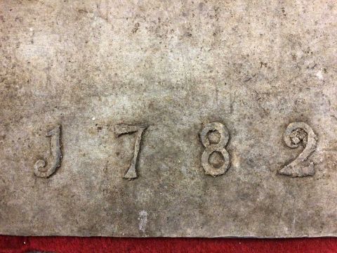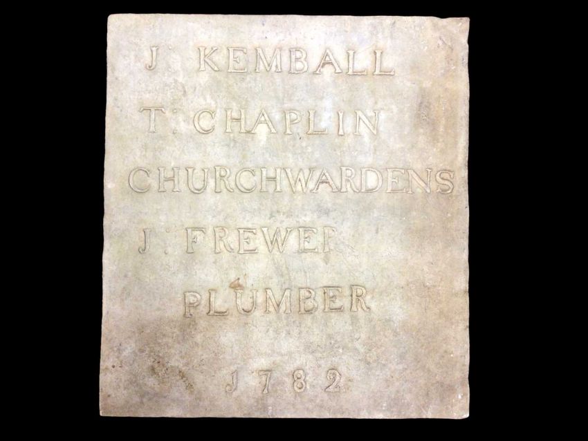 The second of two rare 18th century lead church roof plaques, inscribed "J: KEMBALL / T: CHAPLIN / CHURCHWARDENS / J: FREWER / PLUMBER / 1782', measuring 70.5cm x 78cm