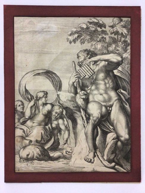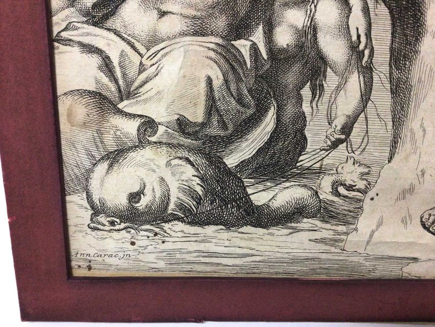 Antique engraving after Annibale Carracci (1560-1609), depicting the savage man-eating cyclops Polyphemus playing music to the sea nymph Galatea, inscribed 'Ann.Carac.jn' lower right, 32.5cm x 24cm