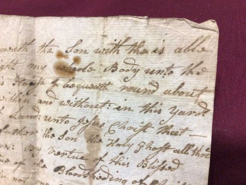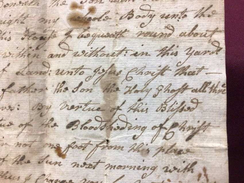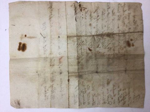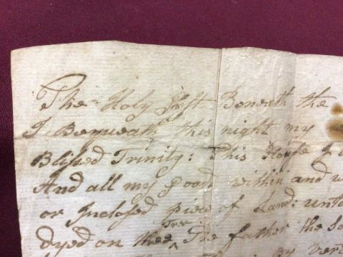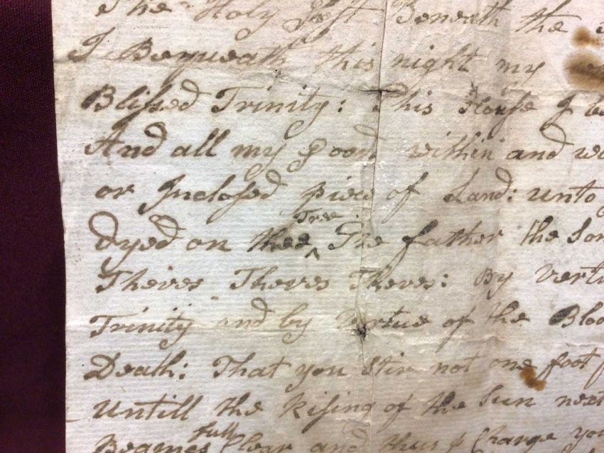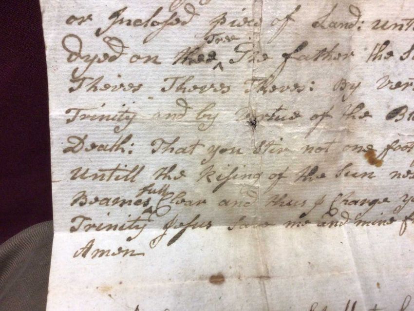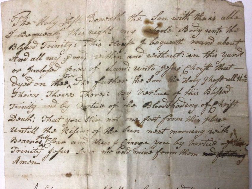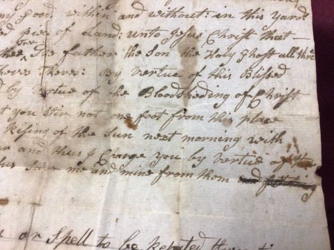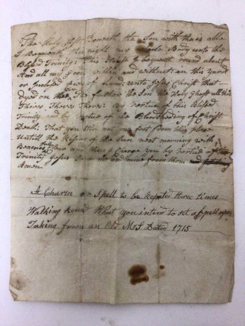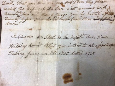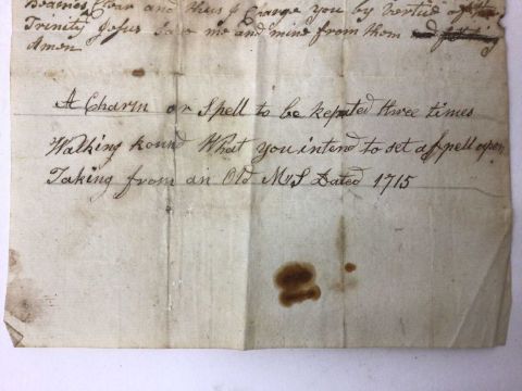 A handwritten spell, inscribed 'A Charm or Spell to be repeated three times walking round what you intended to a set a spell upon. Taking (sic) from an Old MS (?) Dated 1715', the spell written above, addressed on reverse to 'William Leeds Esq', the sheet 22cm x 17cm