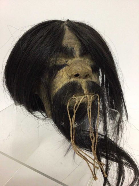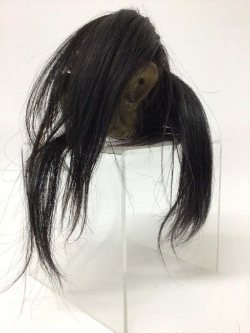 A model of a shrunken head, made with animal hide and human hair, made to resemble the shrunken heads of the Antipas tribe of the Amazon