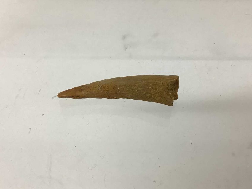 A 110-million-year-old fosillised tooth belonging to the extinct Pterodactyl 'Coloborhynchus'. Known to have inhabited these shores. 2.5cm long. In case with label.