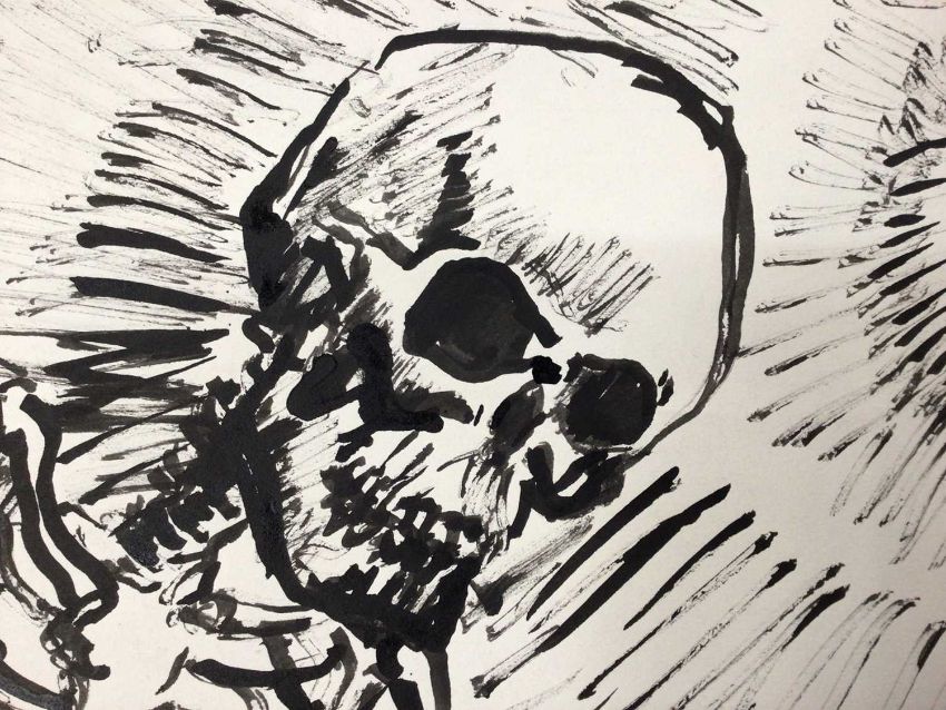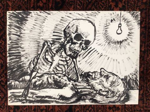 *Colin Moss (1914-2005) Indian ink, a study of death, depicting a living skeleton leaning over a corpse, with a single lightbulb hanging from the ceiling, unsigned, 42cm x 30cm