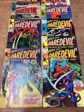 Marvel Comics Daredevil 1966 - 1969 (English and American price variants). To include #19, #25 - first apperance of Leap Frog, Vincent Patilio, #26, #32, #34, #51, #52, #53, #54, #55 and #59. Some in poor condition. (11)