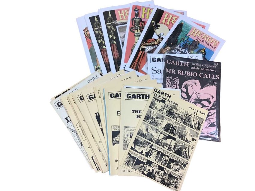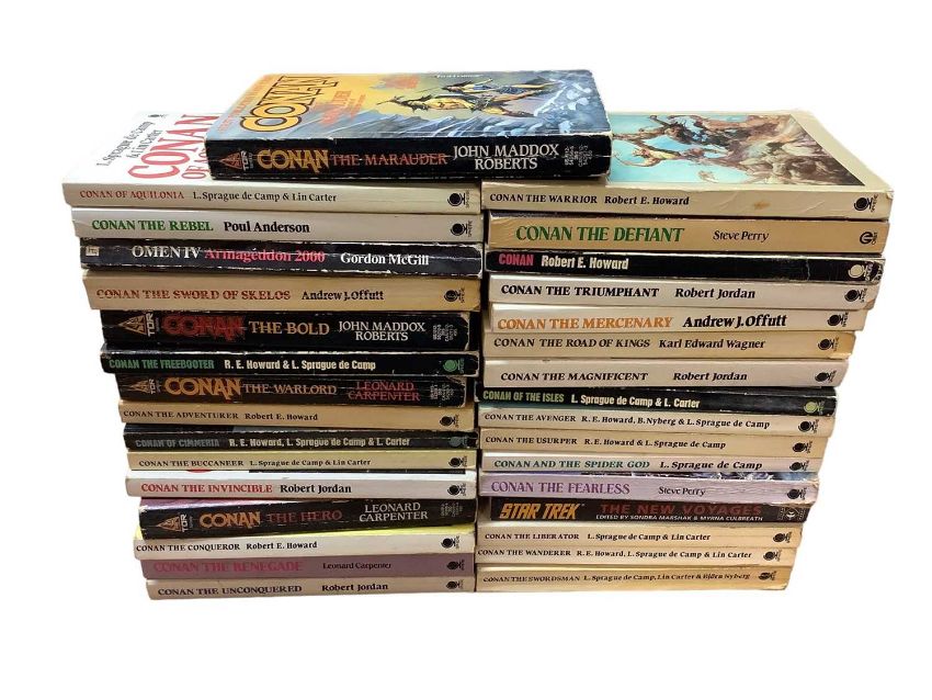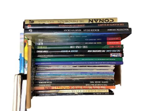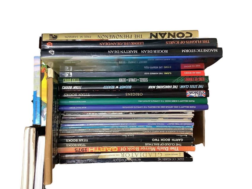 Conan The Phenomenon hard back book by Dark Horse Books, together with another by Roy Thomas and a collection of paper back Conan books by Sphere. Also to include Garth daily strips, Frank Bellamy's Robin Hood and King Arthur and his knights and many other books. Approximately 85 items in lot.