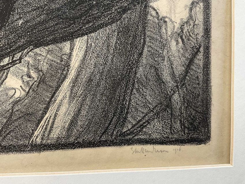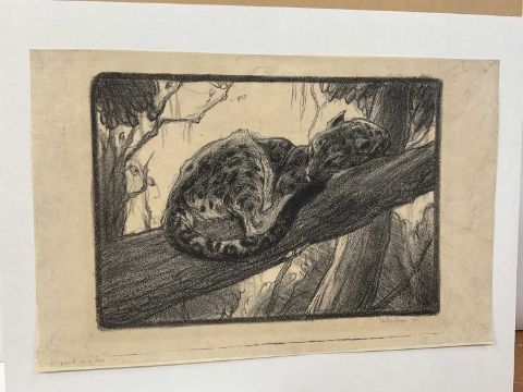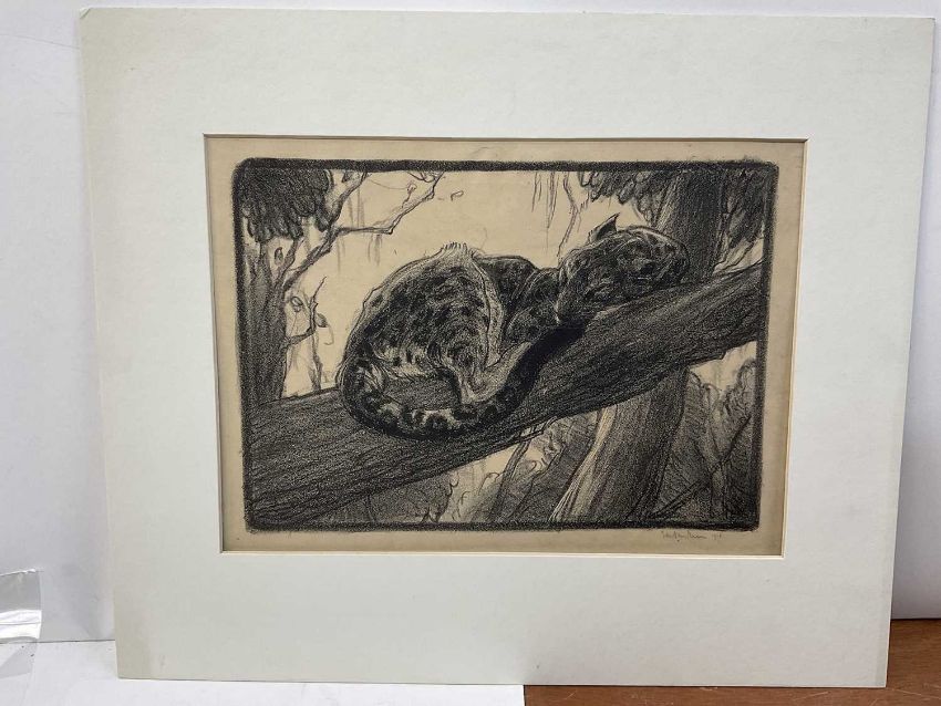 Elsie Henderson (1880-1967) lithograph, Leopard in a tree, image 20 x 30cm, signed and dated 1916, mounted but unframed