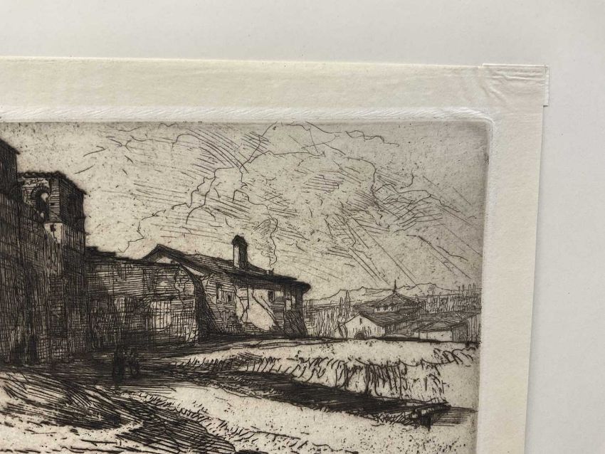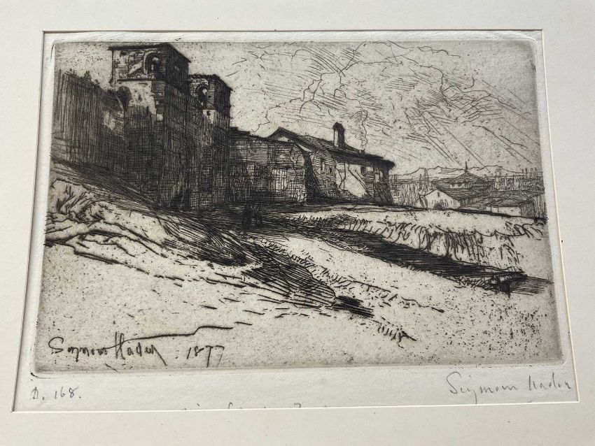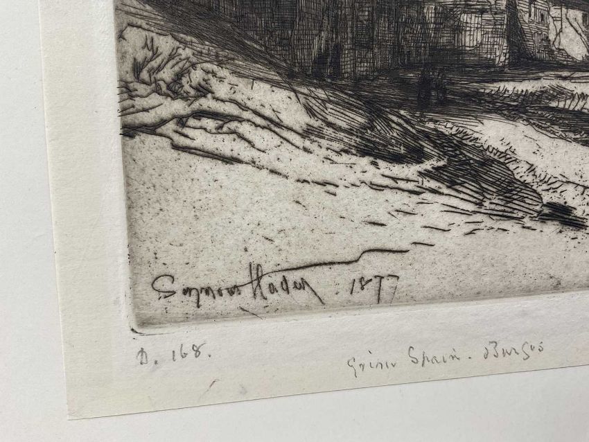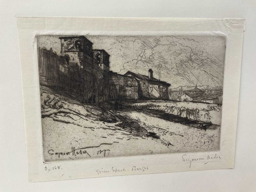 Francis Seymour Haden (1818-1910) drypoint etching - Spain, signed dated 1877 and indistinctly titled, plate 15 x 22cm, mountedL together with a lithograph of Rodin by William Rothenstein. (2)