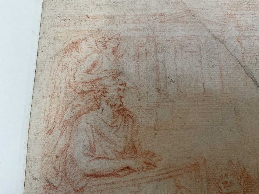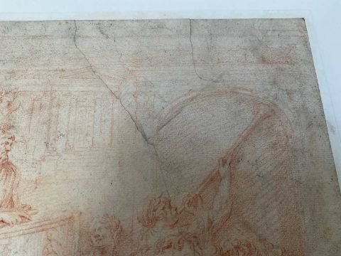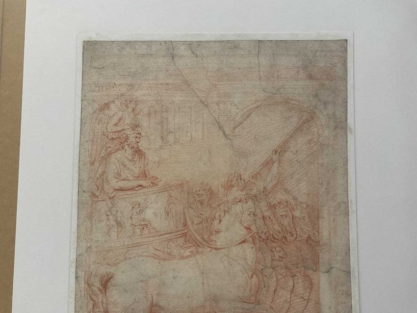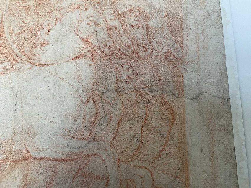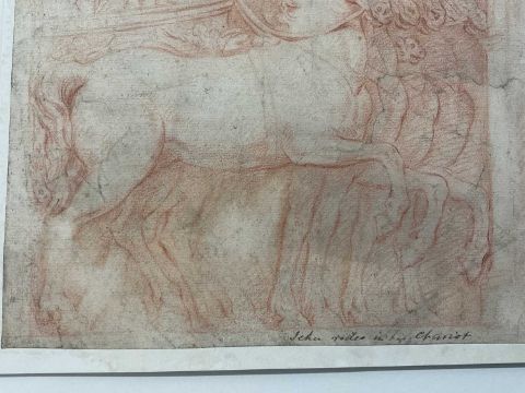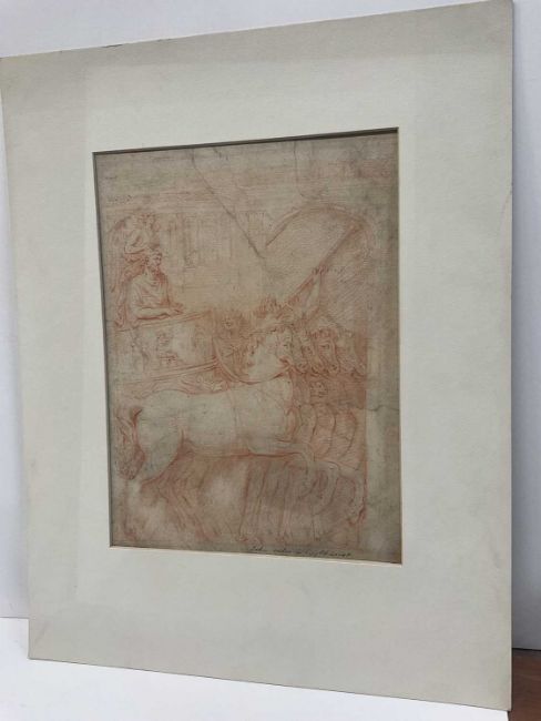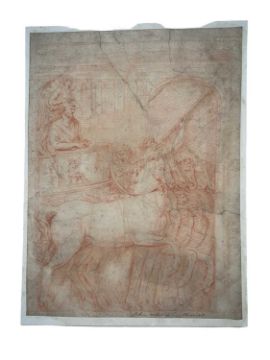 17th century school, red chalk on laid paper, laid down onto board - 'Jehu rides in his chariot', 32 x 24cm, mounted but unframed