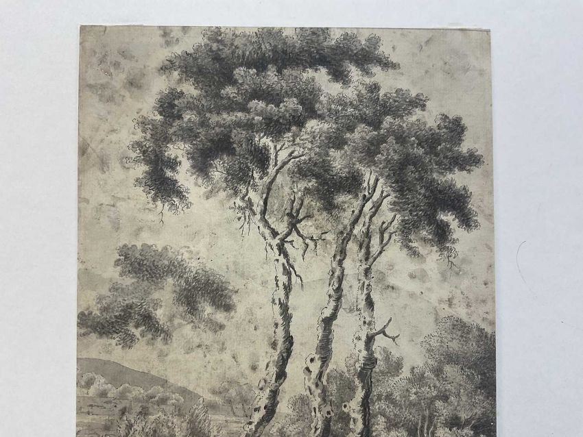 Attributed to Francis Towne (1739-1816), pen and ink and monochrome wash, landscape, 28 x 20cm, signed with initials, dated and inscribed to rear 'From Nature FT 1776' (paper has been laid down so only viewable in strong light - a note to reverse says cleaned and laid down by R Palmer, V & A Museum, mounted but unframed
