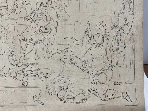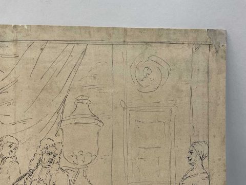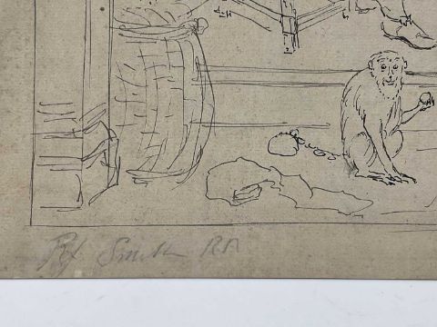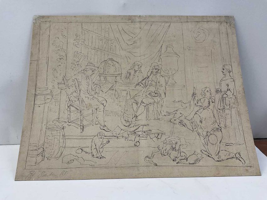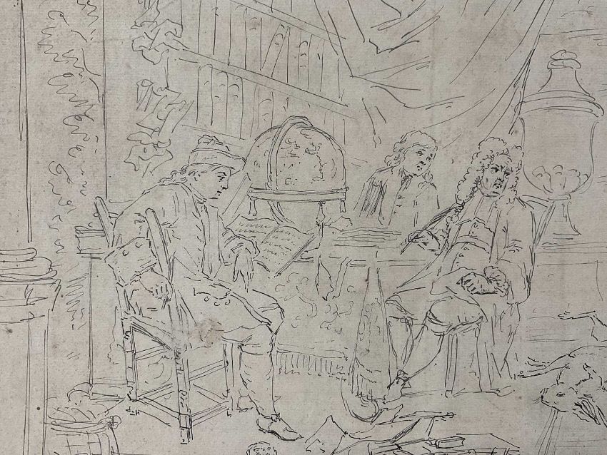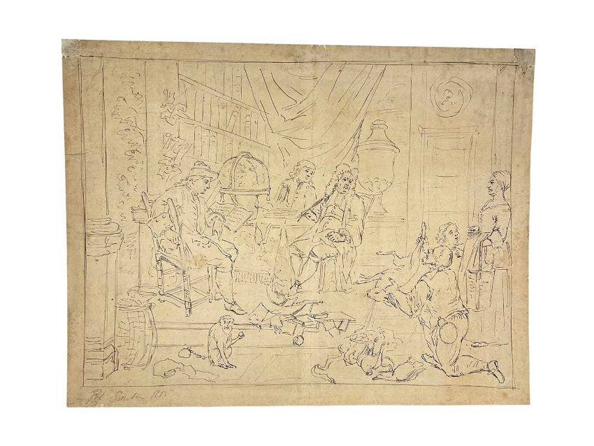 Manner of John Thomas Smith (1766-1833) pen and ink - interior with scholars and game, indistinctly signed to the border, sheet 27 x 36cm