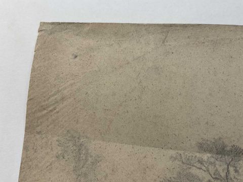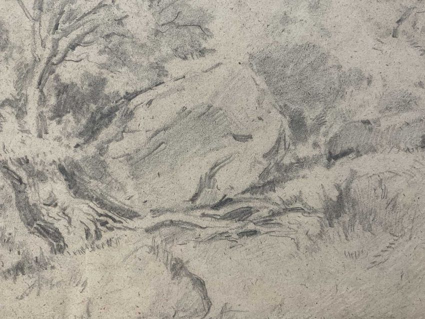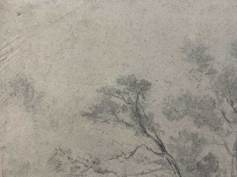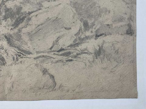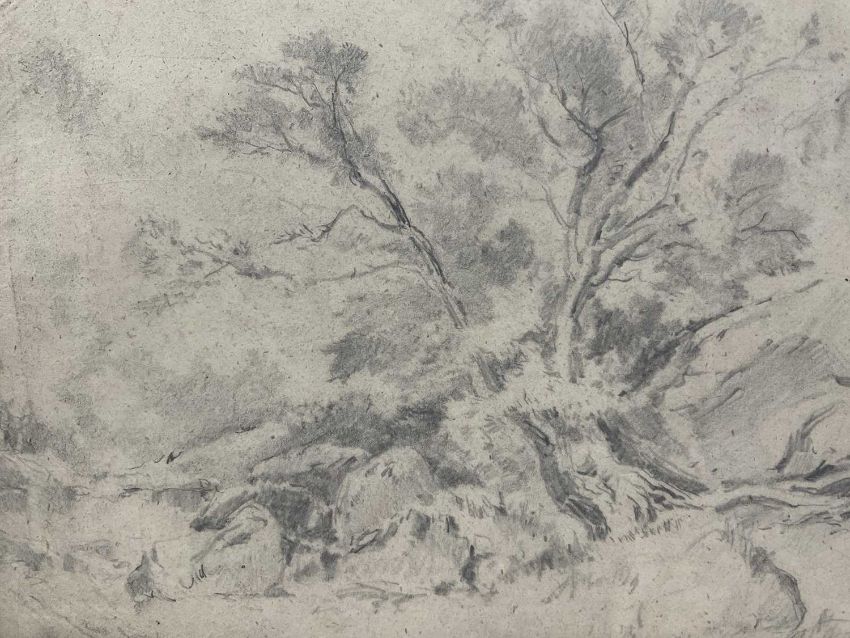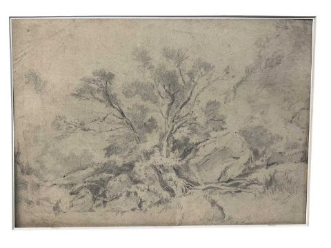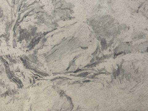 Manner of David Cox (1783-1859) pencil, landscape with tree and rocks, 34 x 47cm, mounted but unframed