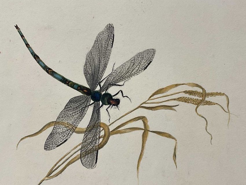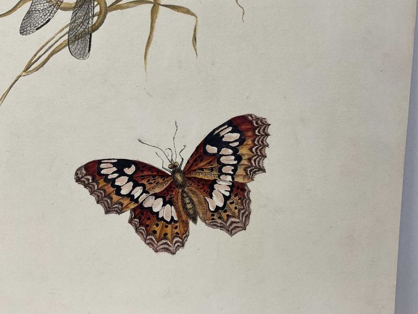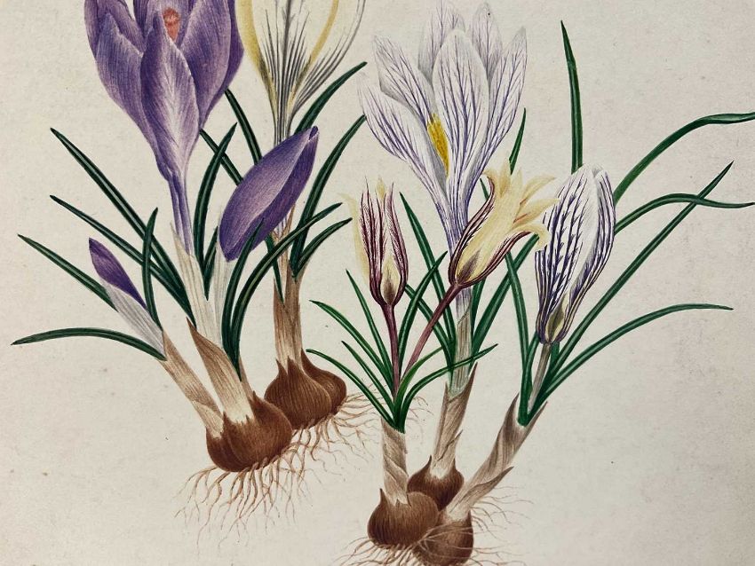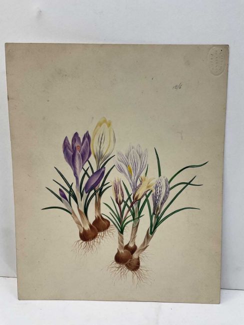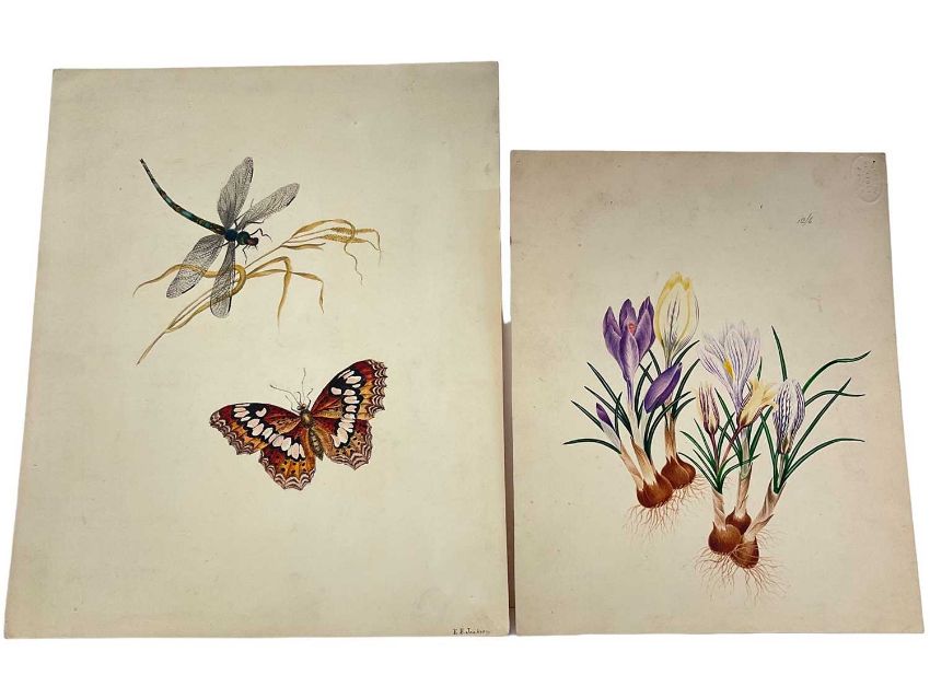 English school 19th century, watercolour depiction of crocuses, 23 x 18cm, together with another of a butterfly and dragonfly. (2)