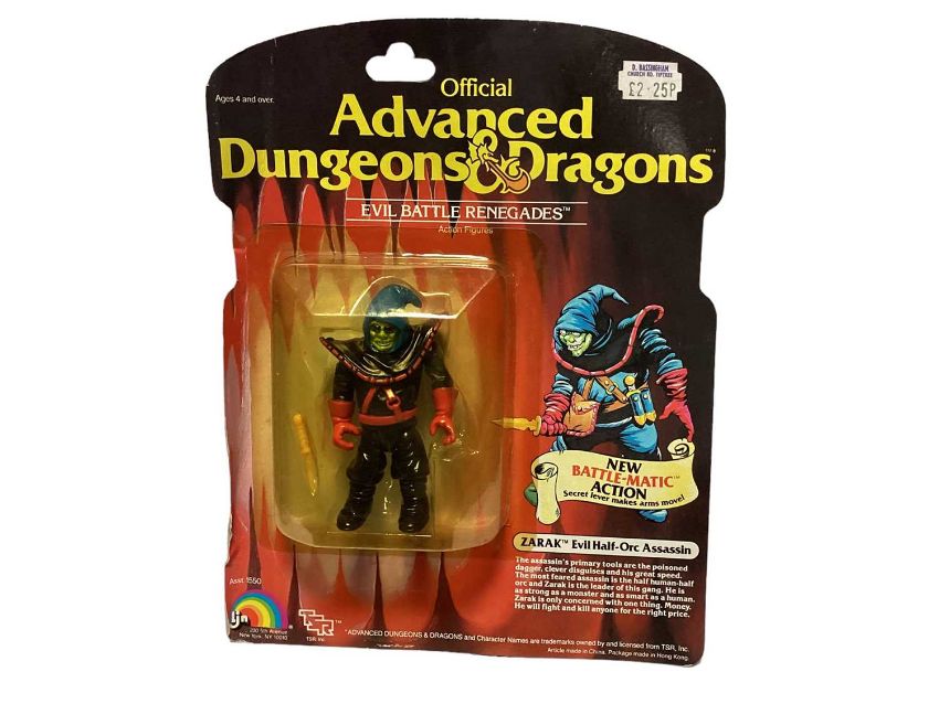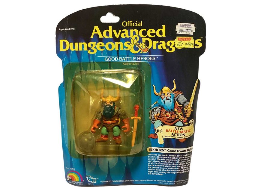LJN (1983) Advanced Dungeons & Dragons action figures including Elkhorn (Good Dwarf Fighter), Deeth (Good Fighter) & Zara's (Evil Half-Orc Assassin), all on card (quite curled) with bubblepack (3)