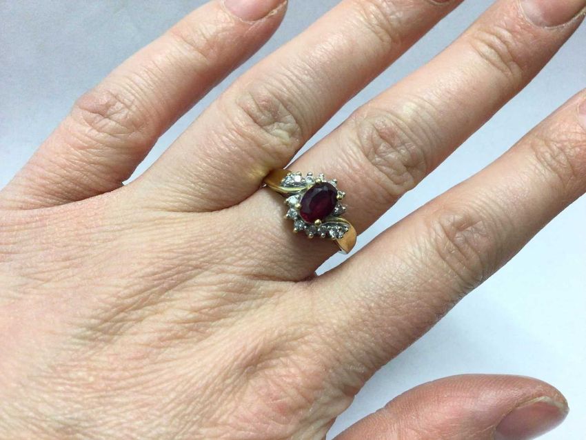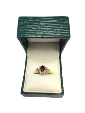 18ct gold ruby and diamond cluster ring with an oval mixed cut ruby surrounded by fourteen brilliant cut diamonds, estimated to weigh 0.25cts in total, in a cross over setting, size O½