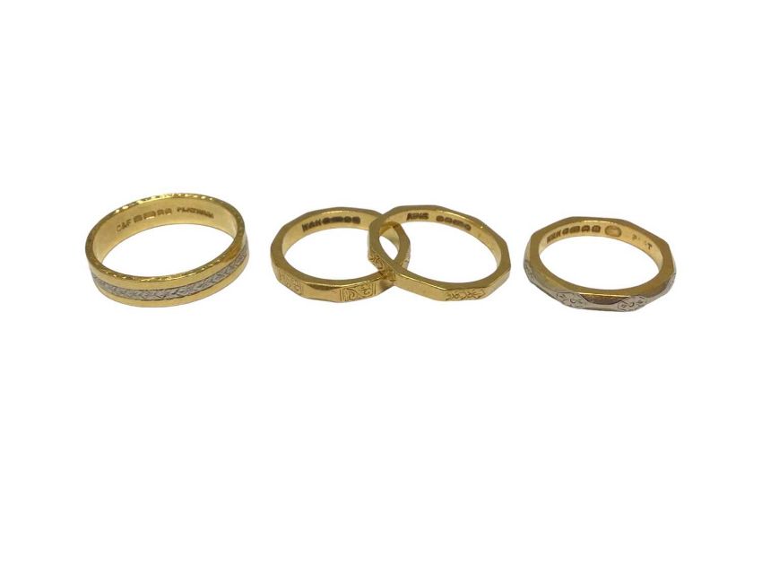 22ct gold and platinum wedding ring, size O and three other 22ct gold wedding rings, sizes H½- I (4)