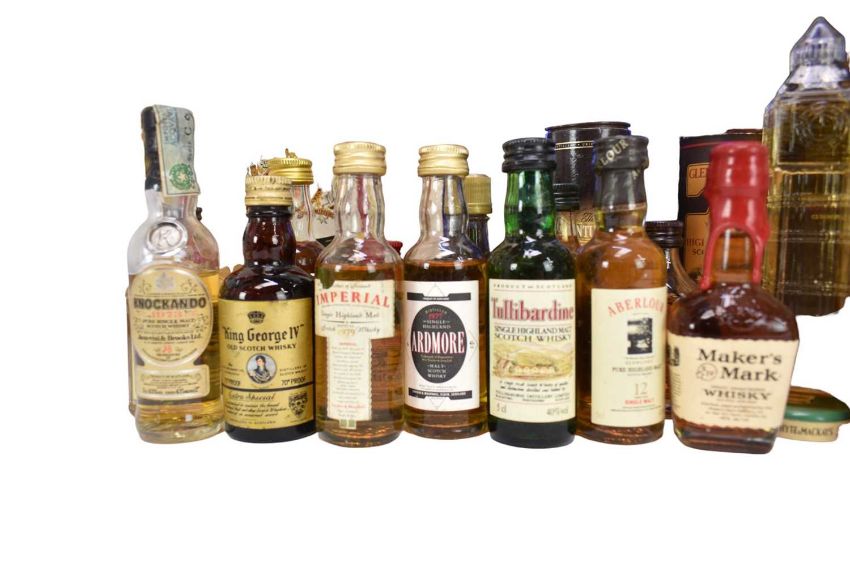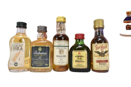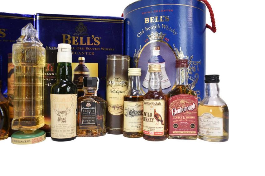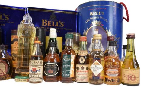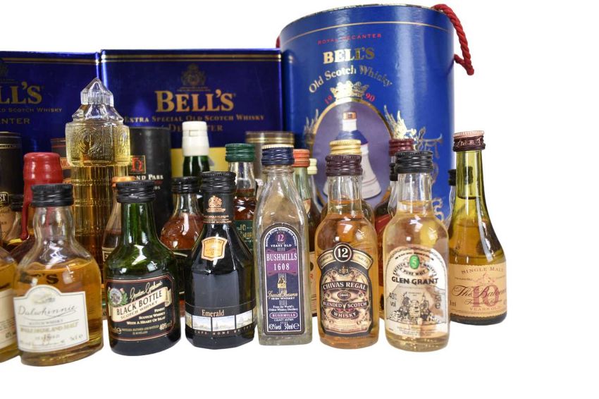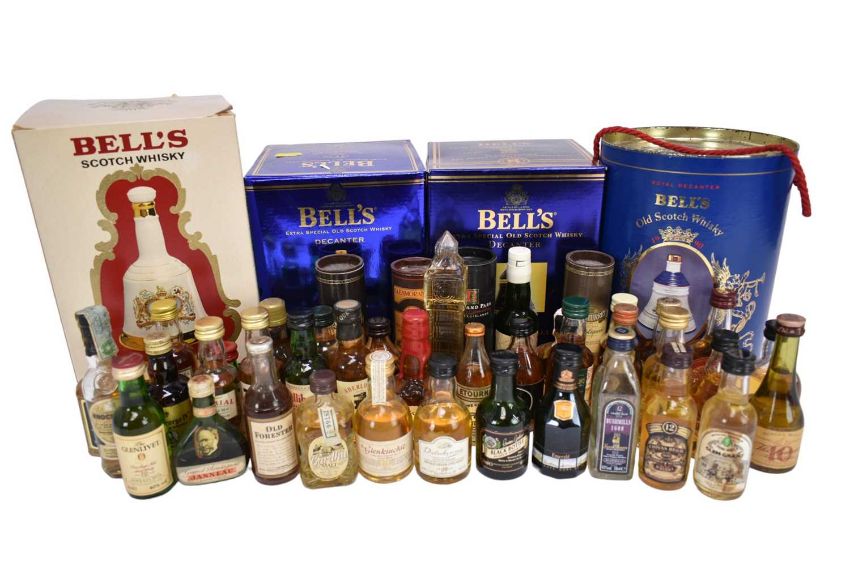 Forty-seven bottles, to include thirty three Whisky miniatures and four Bells Whisky decanters with contents in boxes