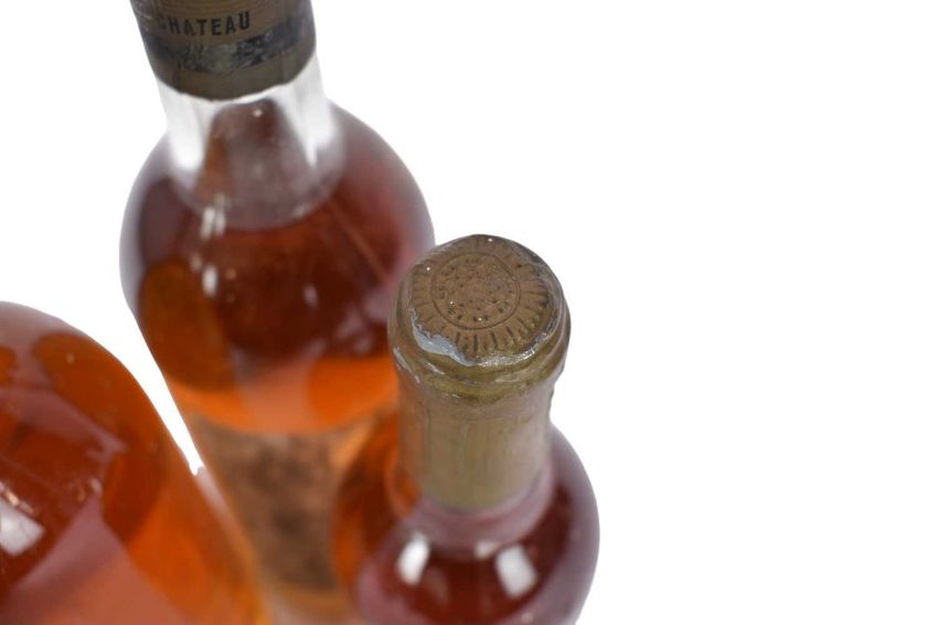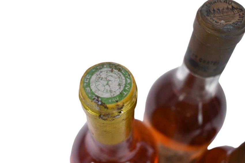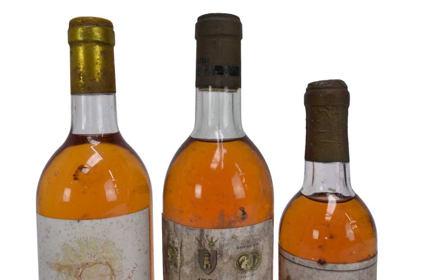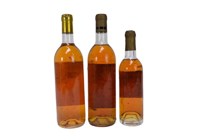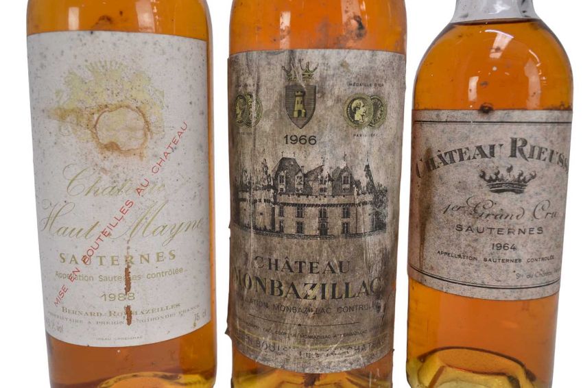 Three bottles, Chateau Monbazillac 1966, Chateau Haut Mayne Sauternes 1988 and a half bottle of Chateau Rieussec 1964