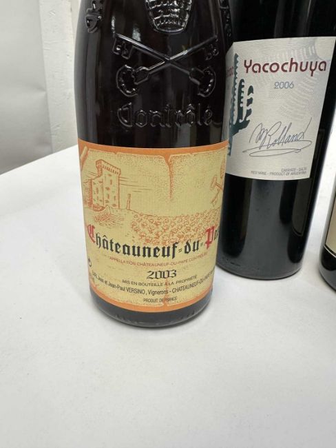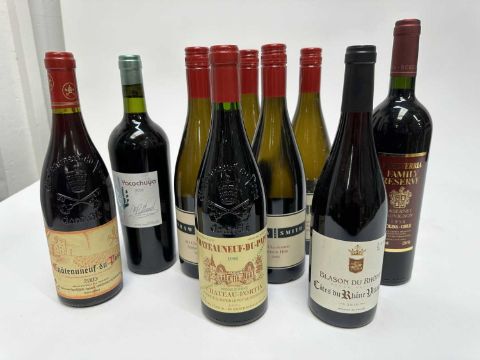 Nine bottles, to include: Chateau-Fortia Chateauneuf-du-Pape 1998, Chateauneuf-du-Pape 2003, Blason du Rhône Cote du Rhône Villages 2016, Shaw and Smith M3 Chardonnay 2008 (4) and two other bottles