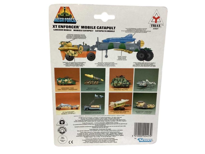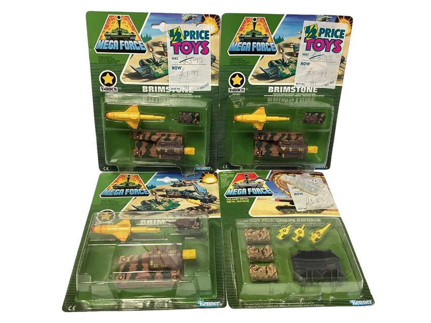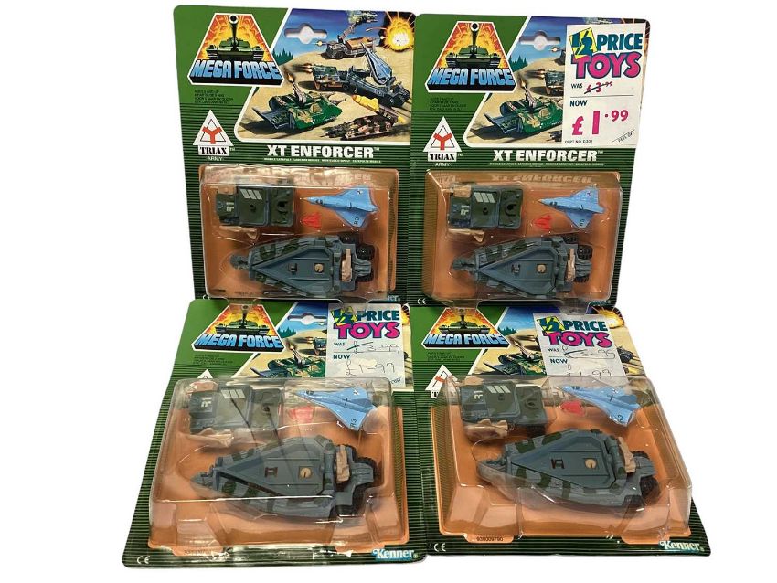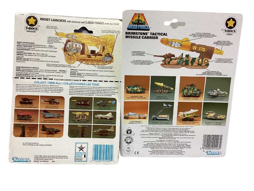 Kenner (c1989) Mega Force diecast Triax & V-Rocs Combat Vehicles including XT Enforcer (x4), Brimstone (x3) & Attack Pack, on card with bubblepacks (8)