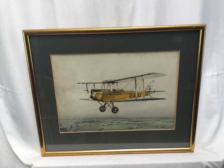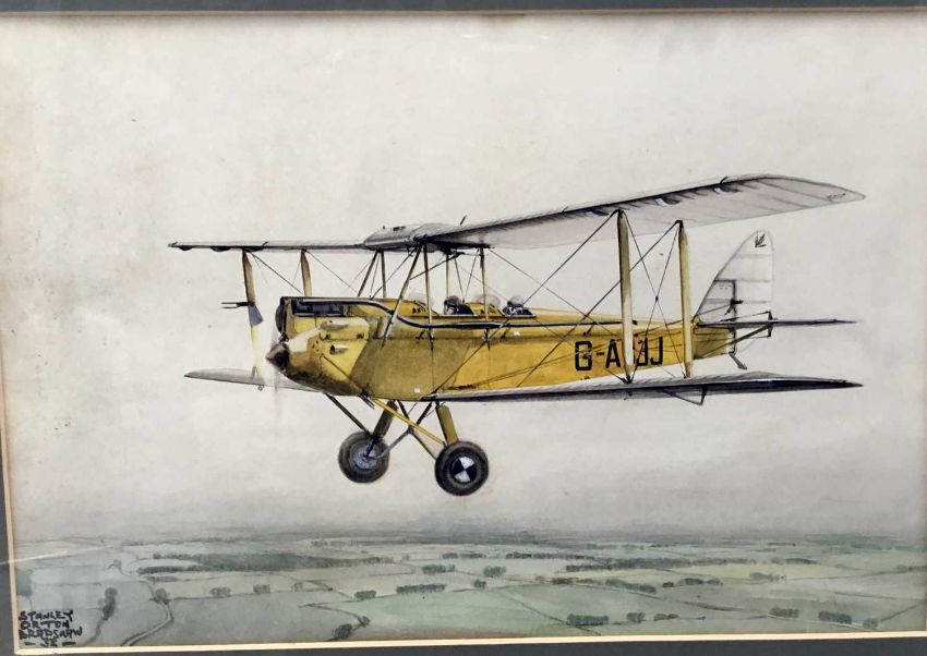Stanley Orton Bradshaw (1903-1950) watercolour - Bi-plane in flight, signed and dated 1935, 21cm x 31cm, in glazed frame