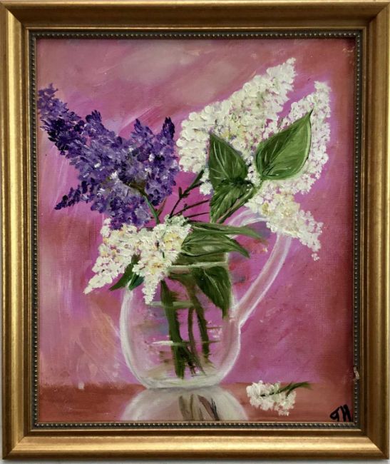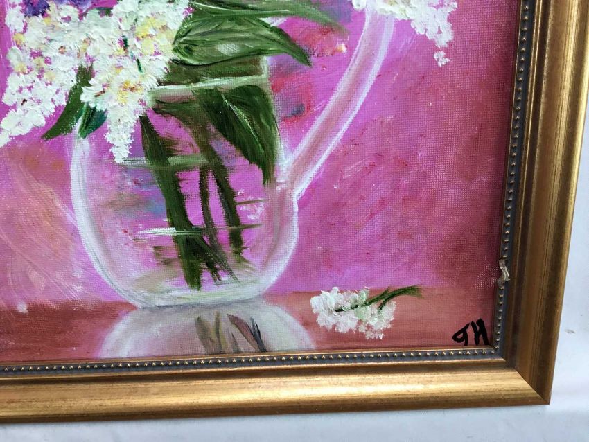 Jasmine Holme, oil on board, Lilac blossom in a glass vase, signed with initials, also inscribed verso, in gilt frame, 35 x 27cm