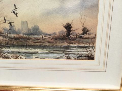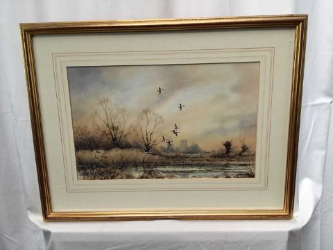 S.Trinder, watercolour, Winter landscape with ducks in flight across a river with church in the distance, in glazed gilt frame, 24cm x 38cm.