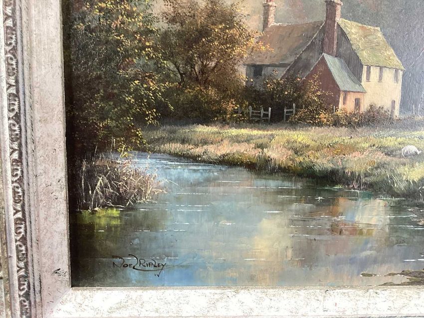 Noel Ripley (Born 1944) pastoral scene with sheep by a river in the foreground a farm beyond, oil on board, signed, in painted frame. 29 x 39cm