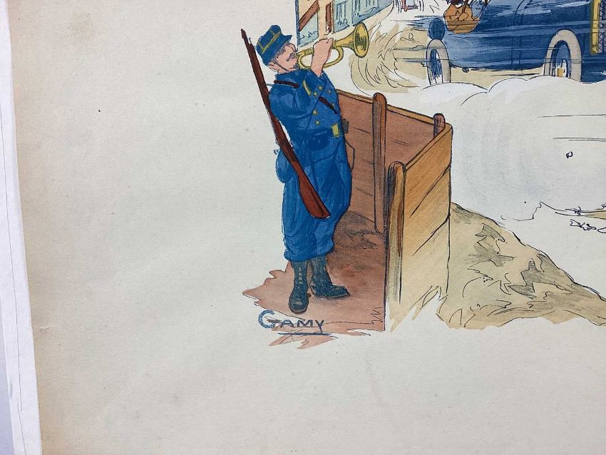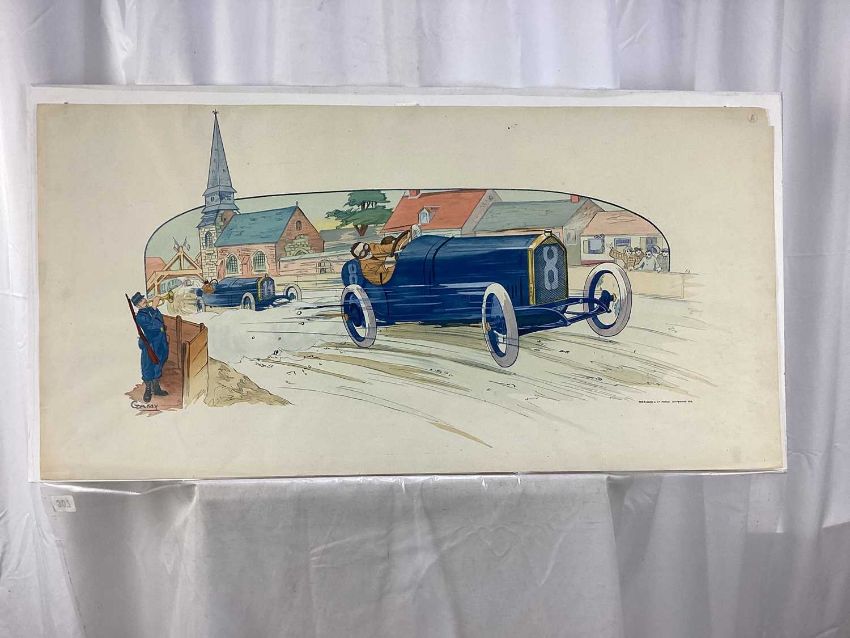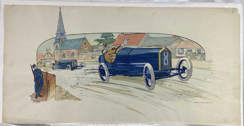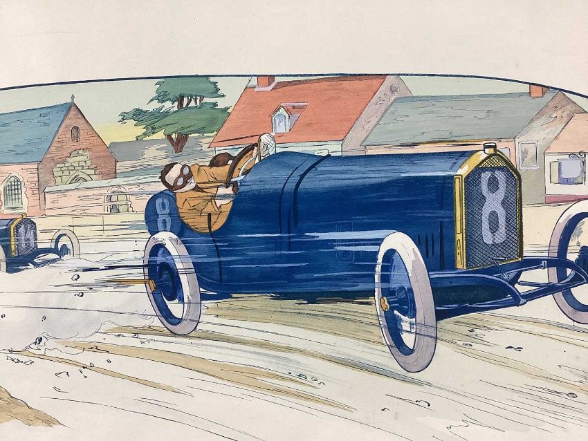 Marguerite Gamy (1883-1936) coloured lithograph - G.P de France 1913, Baillot devant Goux, 45cm x 90cm, unframed