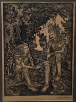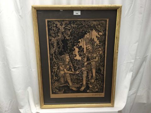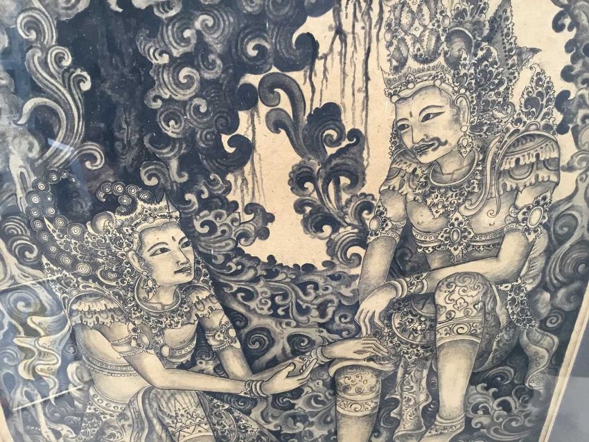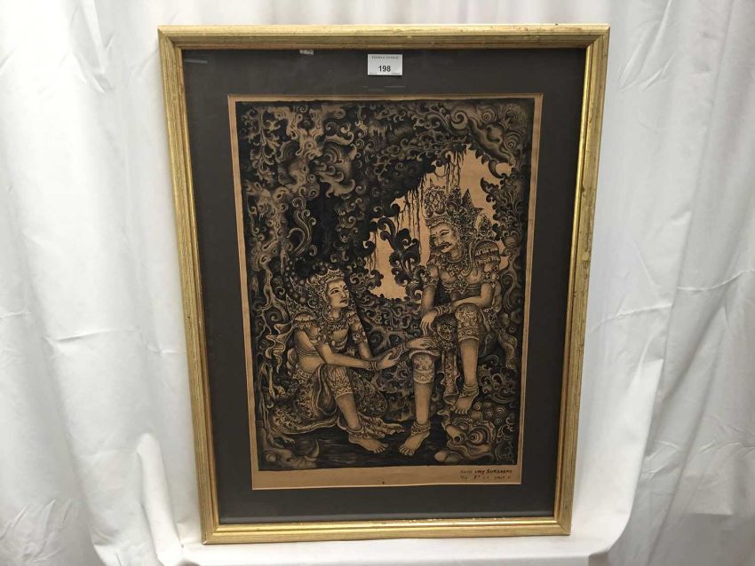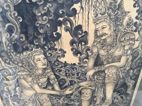 Thai monochrome watercolour, Deity figures, inscribed, 47 x 33cm, glazed frame