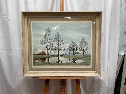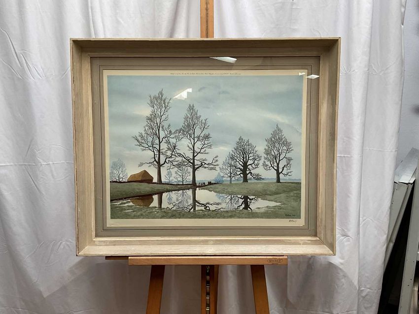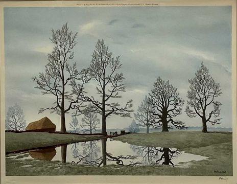 Tristram Hillier (1905-1983), signed print, dated 1949, 'Flooded Meadow', 61cm x 45cm
