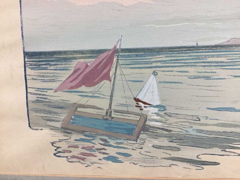 The paper is not laid down, just attached on the top edge in the correct way. The colours are good, some minor tears along the edge but currently hidden by the mount. Good overall. Water damage to the mount.