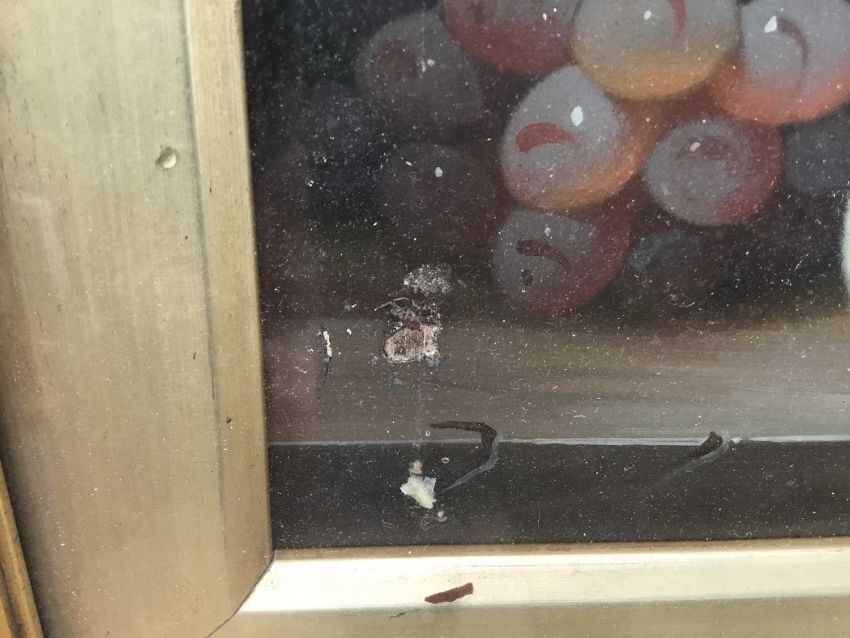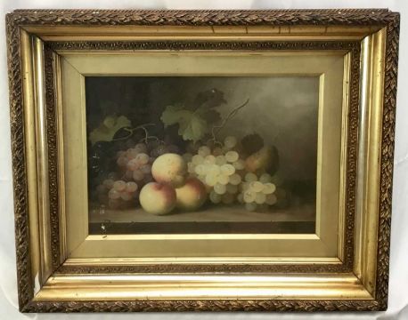 After Edward Ladell, oil on wood board - Still life with peaches, pear and grapes with vines on a marble ledge, 24cm x 34cm, behind glass in gilt frame