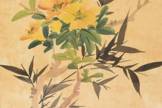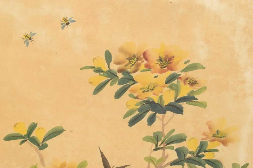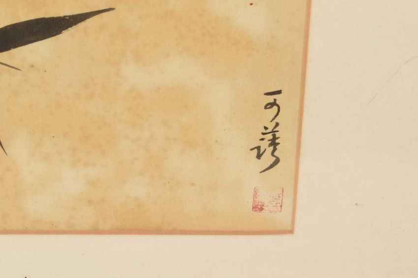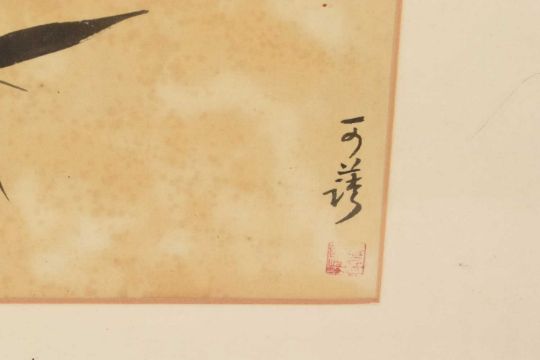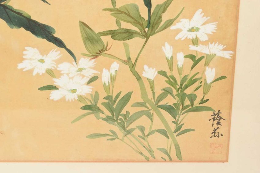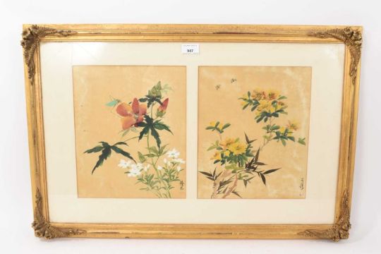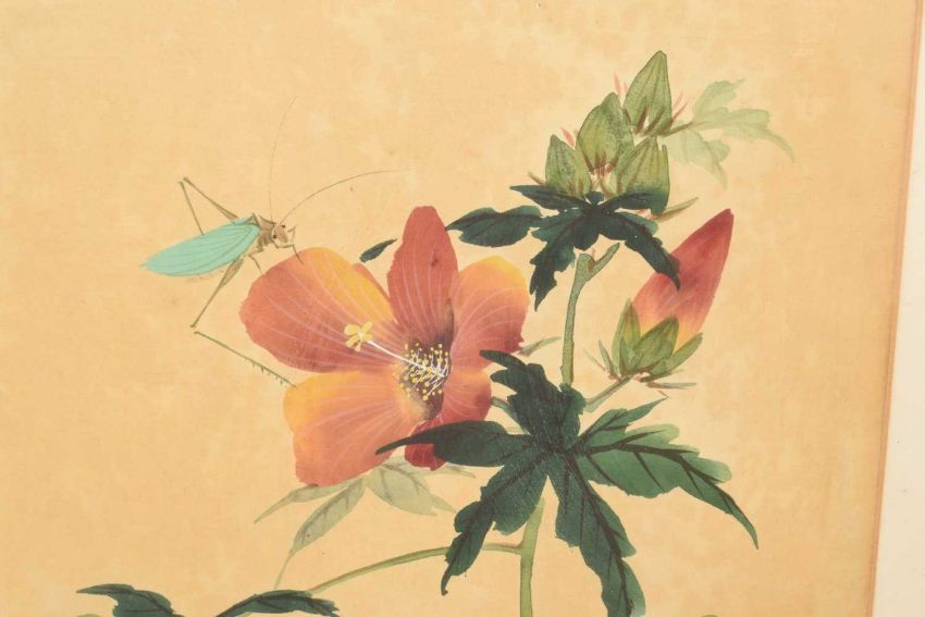 Pair of Chinese brush paintings on silk, depicting flowers and insects, each signed, 30 x 25cm, in Victorian glazed gilt frame