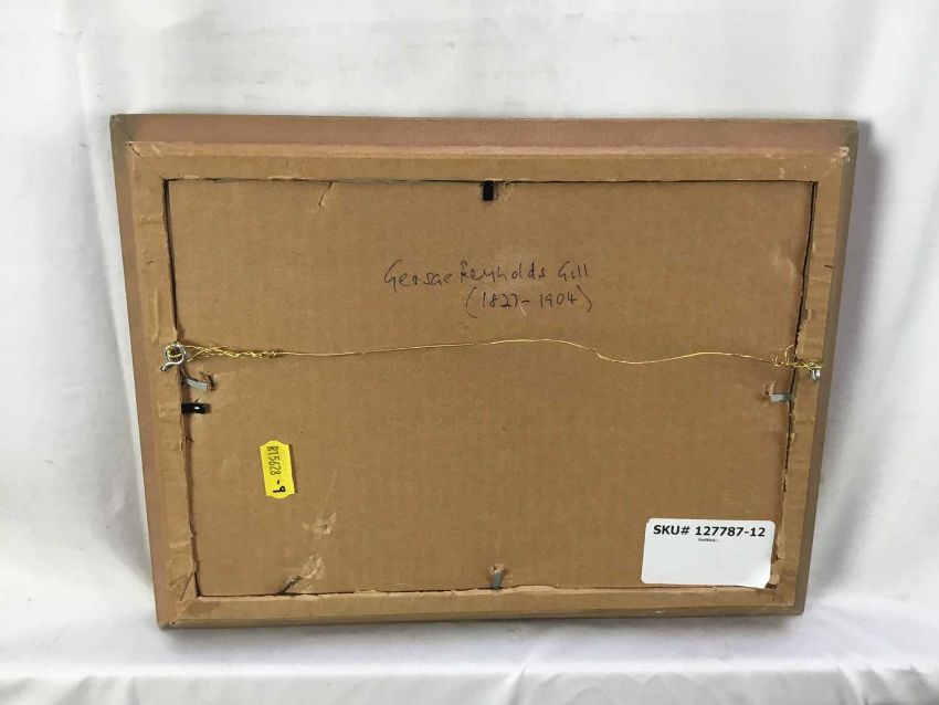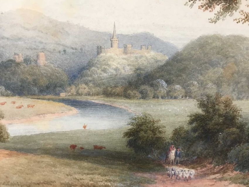 George Reynolds Gill (1827-1904) watercolour, Droving sheep in an extensive landscape with a fortified castle beyond, 18cm x 25.5cm, in glazed frame