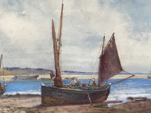 Joseph Hughes Clayton (1870-1930) watercolour of Newlyn harbour depicting Cornish fishermen with boats at low tide, signed and titled 'Low tide, Newlyn' in glazed gilt frame, 27cm x 67cm.