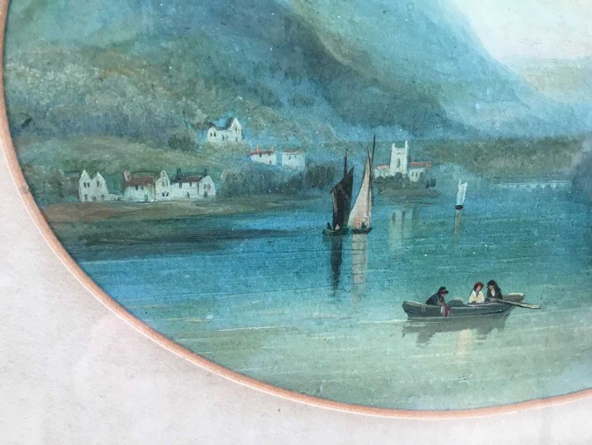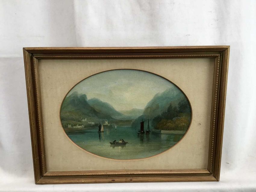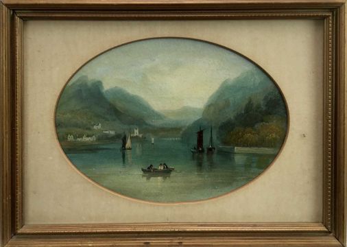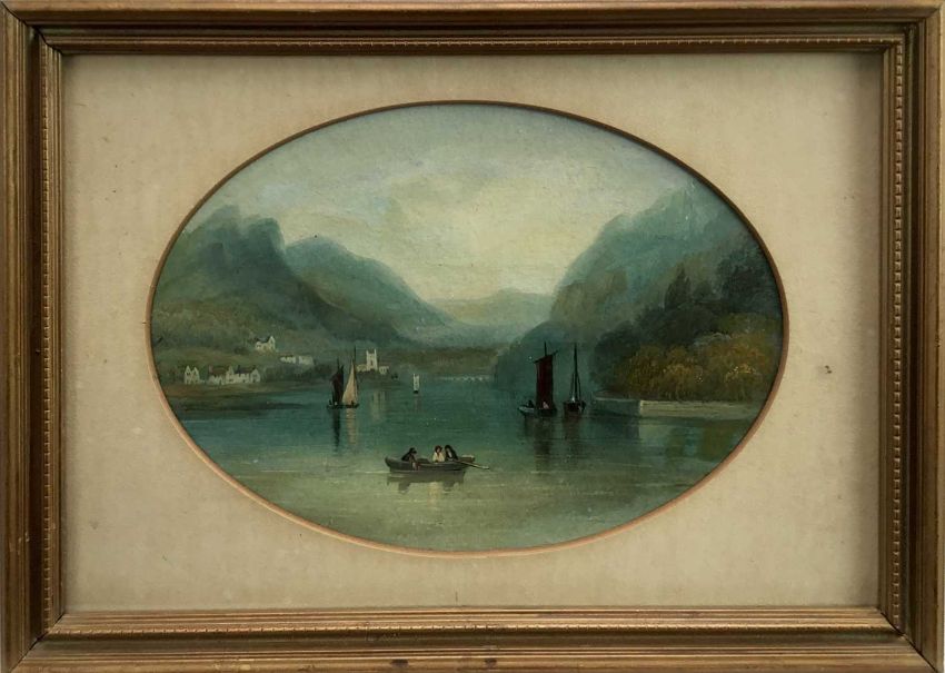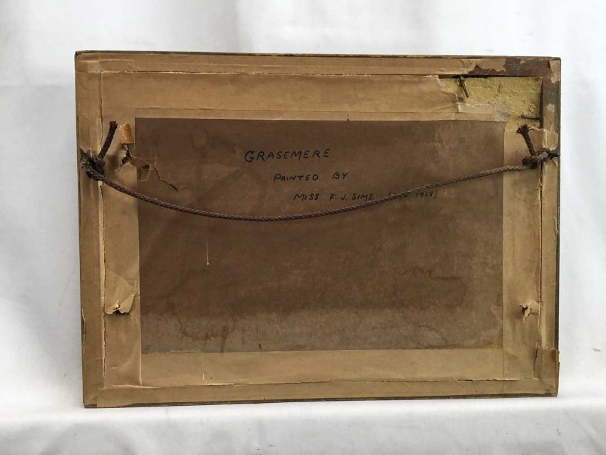 Miss F.J. Sims, oval oil on board, view of Grassmere, inscribed verso, in gilt frame, 14 x 19cm