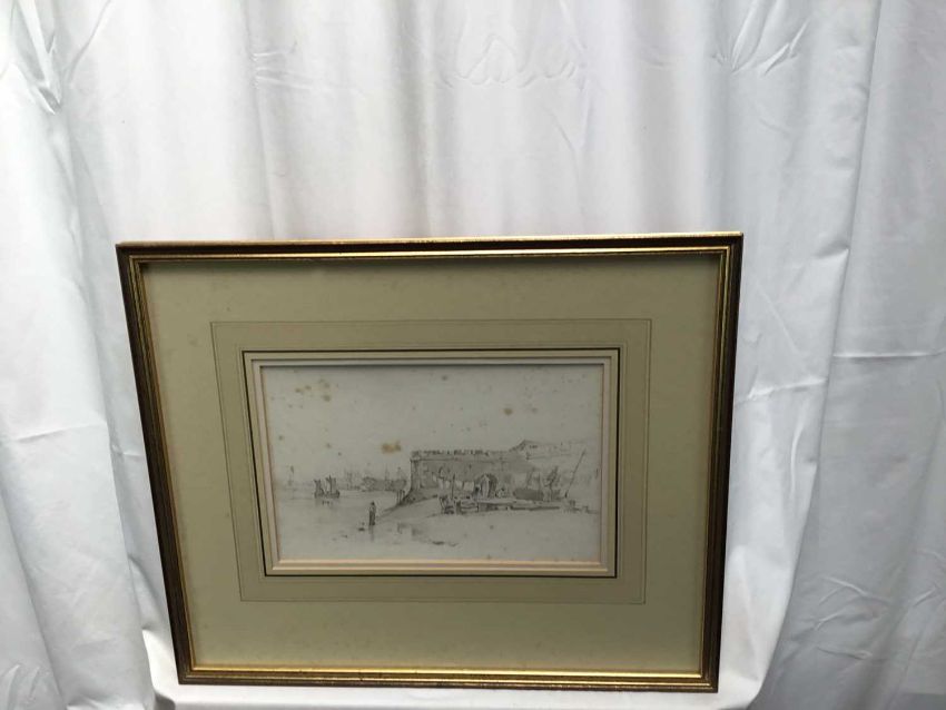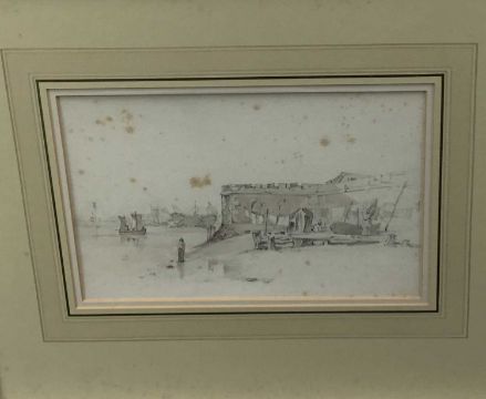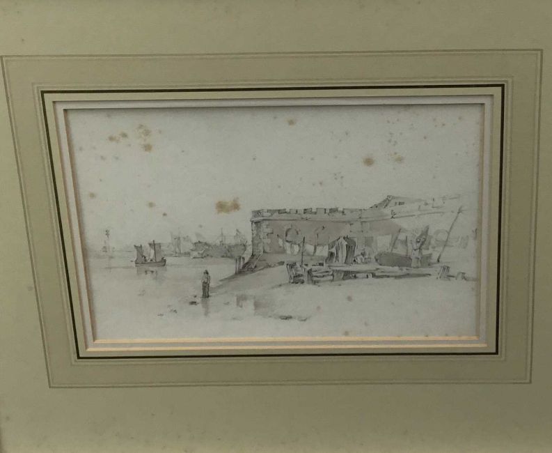 Henry Haseler (act. 1814-1825) pencil and brown wash, The entrance to Portsmouth Harbour with a prison ship lying beyond, inscribed with title, 19cm x 30.5cm