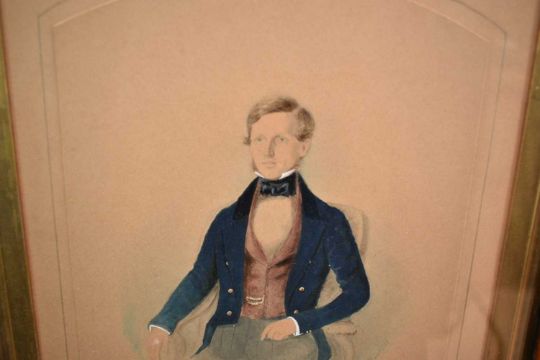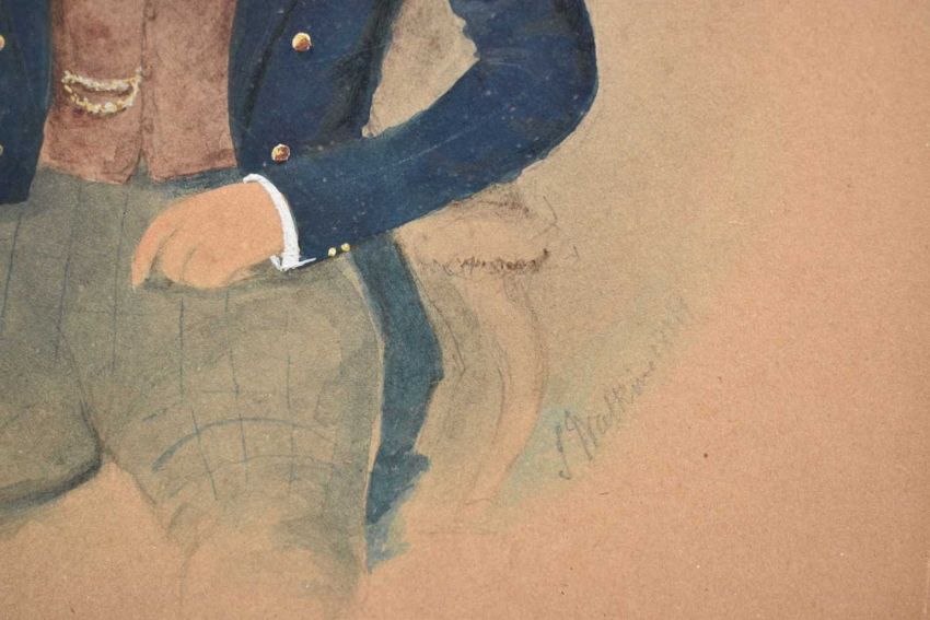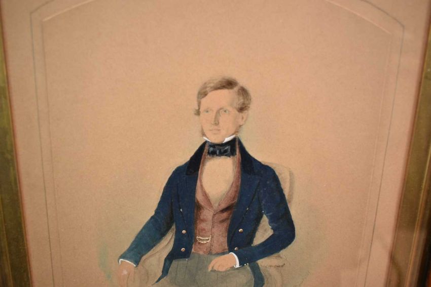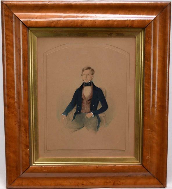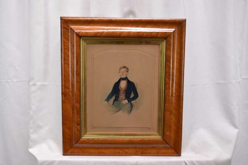 John Watkins, 19th century, watercolour, smartly dressed young gentleman seated in a chair, signed and dated 1841, 22.5 x 20cm, in maple frame