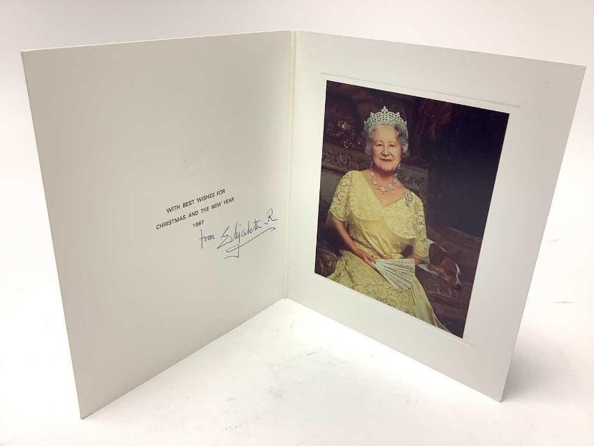 H.M. Queen Elizabeth The Queen Mother, signed 1987 Christmas card with gilt embossed crown to cover, colour photograph of Her Majesty wearing a ball gown with a sleeping corgi beside her, signed in ink 'from Elizabeth R'