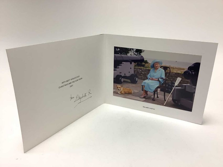 H.M. Queen Elizabeth The Queen Mother, signed 2001 Christmas card (the last Christmas card Her Majesty sent before her death in 2002) with gilt embossed crown to cover, colour photograph of Her Majesty seated with a Corgi at Walmer Castle, signed in ink 'from Elizabeth R'